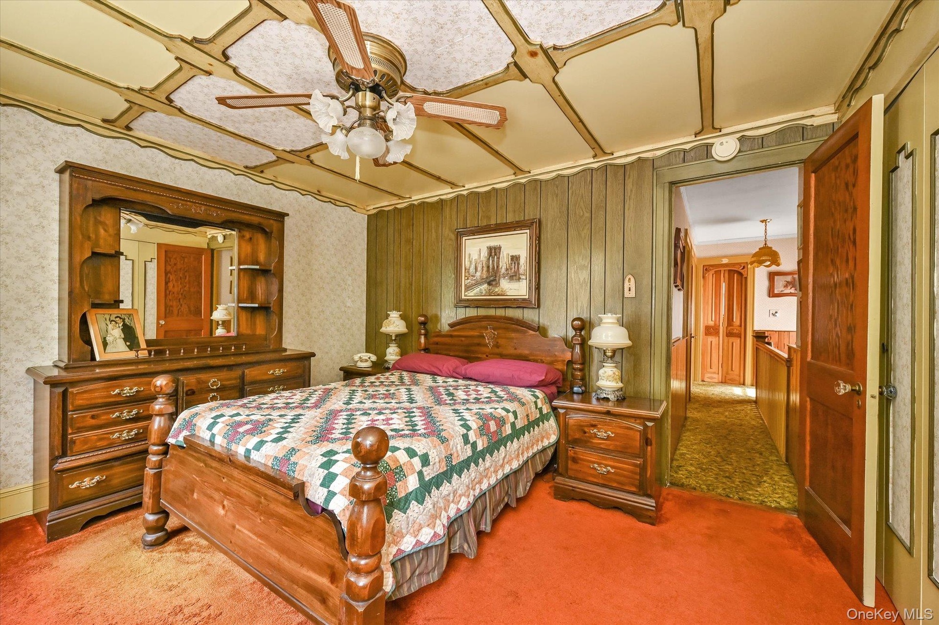 - Dining space featuring wood walls, coffered ceiling, a wainscoted wall, ceiling fan, and beamed ceiling