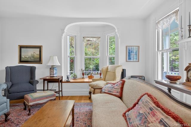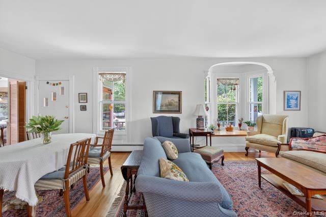 - Living room with wood finished floors, plenty of natural light, and baseboard heating