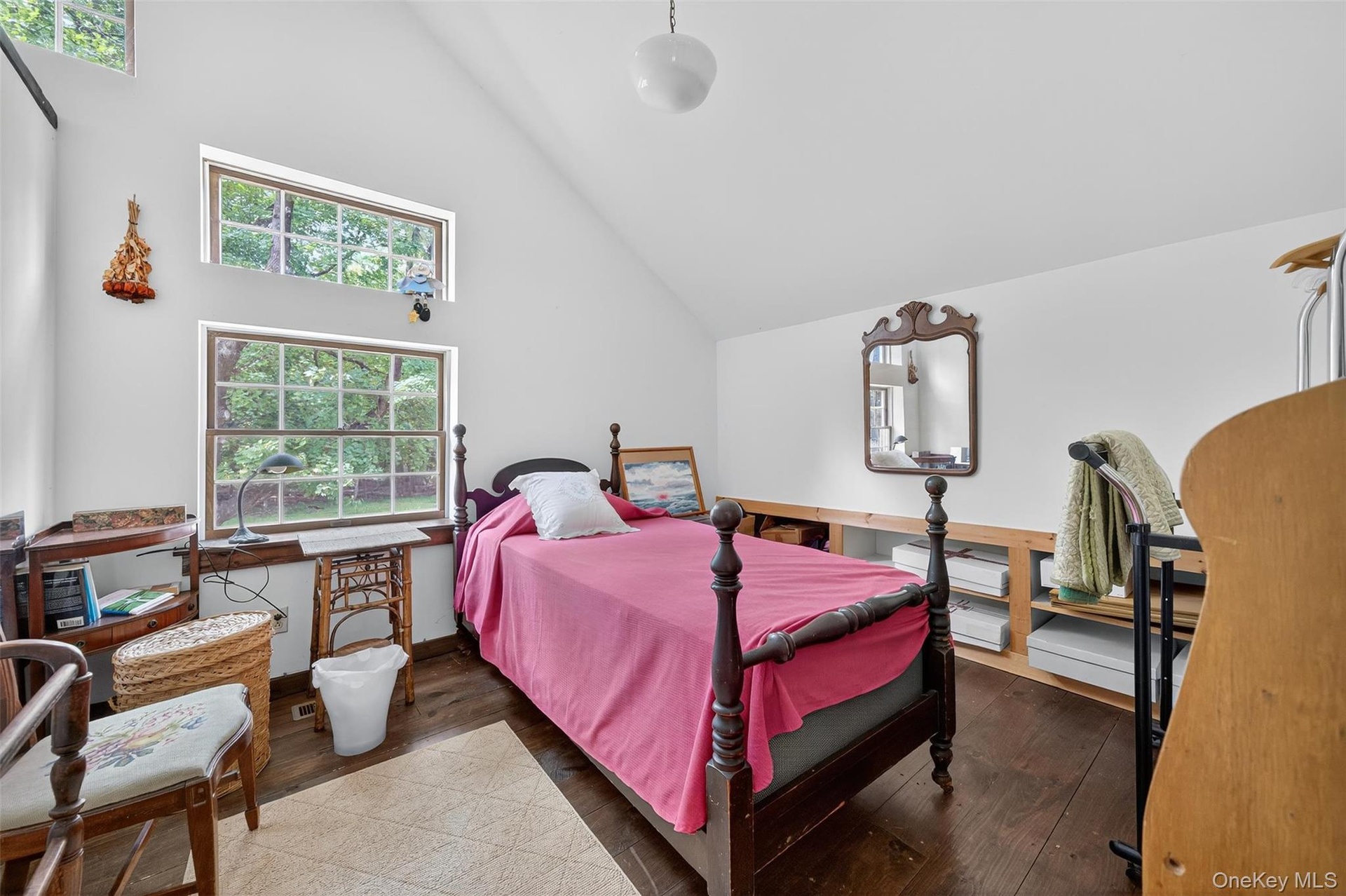 Second Building (The barn - renovated 1995, approx. 1,400 sq. ft.): Main level includes a 350 sq. ft. office and attached 2-car garage; upper level features a sun-filled sitting room, studio with kitchenette, two additional rooms, and half bath. Perfect as a guest house, art studio, religious studies or home office. Showcasing dramatic architectural details, abundant natural light, central air and heating.