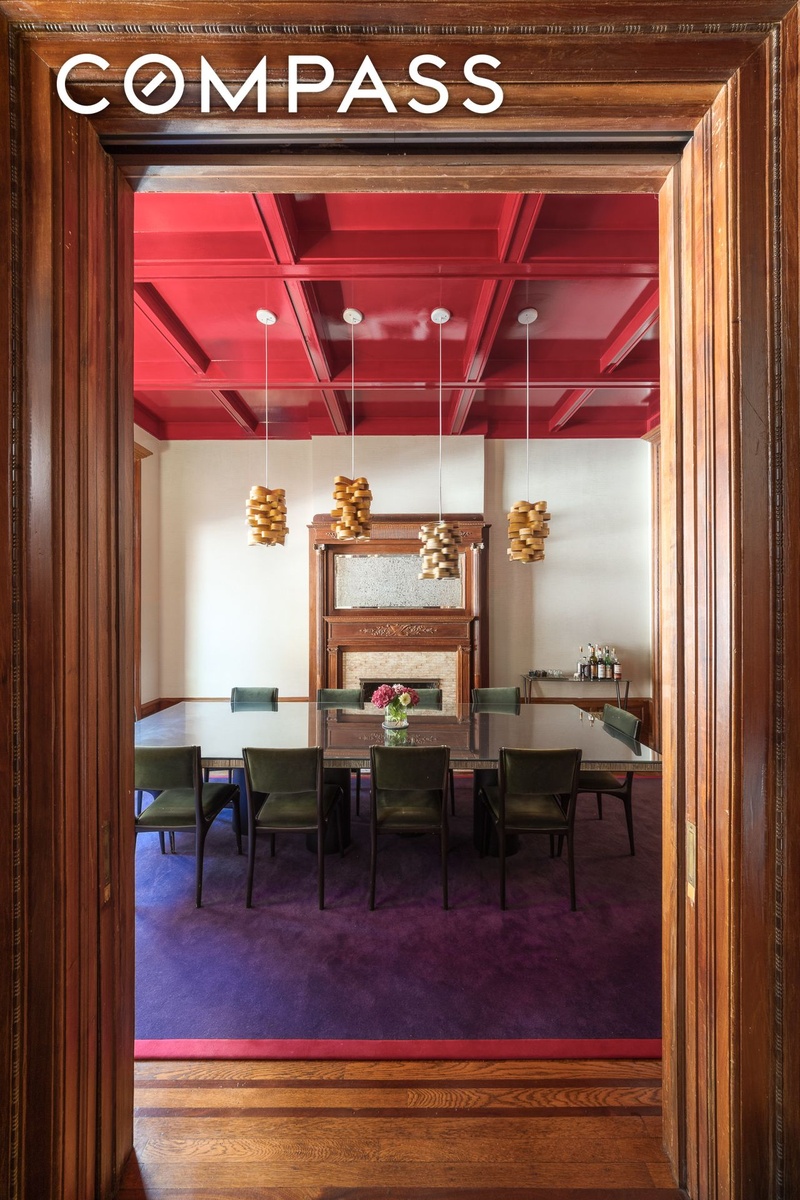 The parlor floor with its original woodwork and restored plaster moldings welcomes you as you enter the formal dining room with its oversized windows facing the tree-lined street. Walk thru the kitchen, thoughtfully designed with professional-grade appliances and a dedicated breakfast area with banquette, and into the formal living room, overlooking the landscaped garden below through south-facing bay windows. A period wood-burning fireplace provides an elegant focal point for entertaining along with a prep kitchen and wet bar, tucked just off the living space.