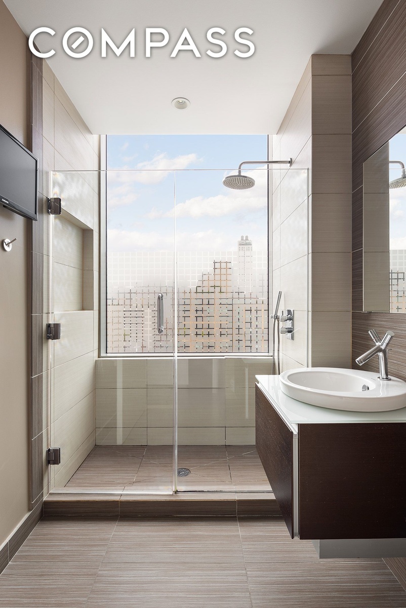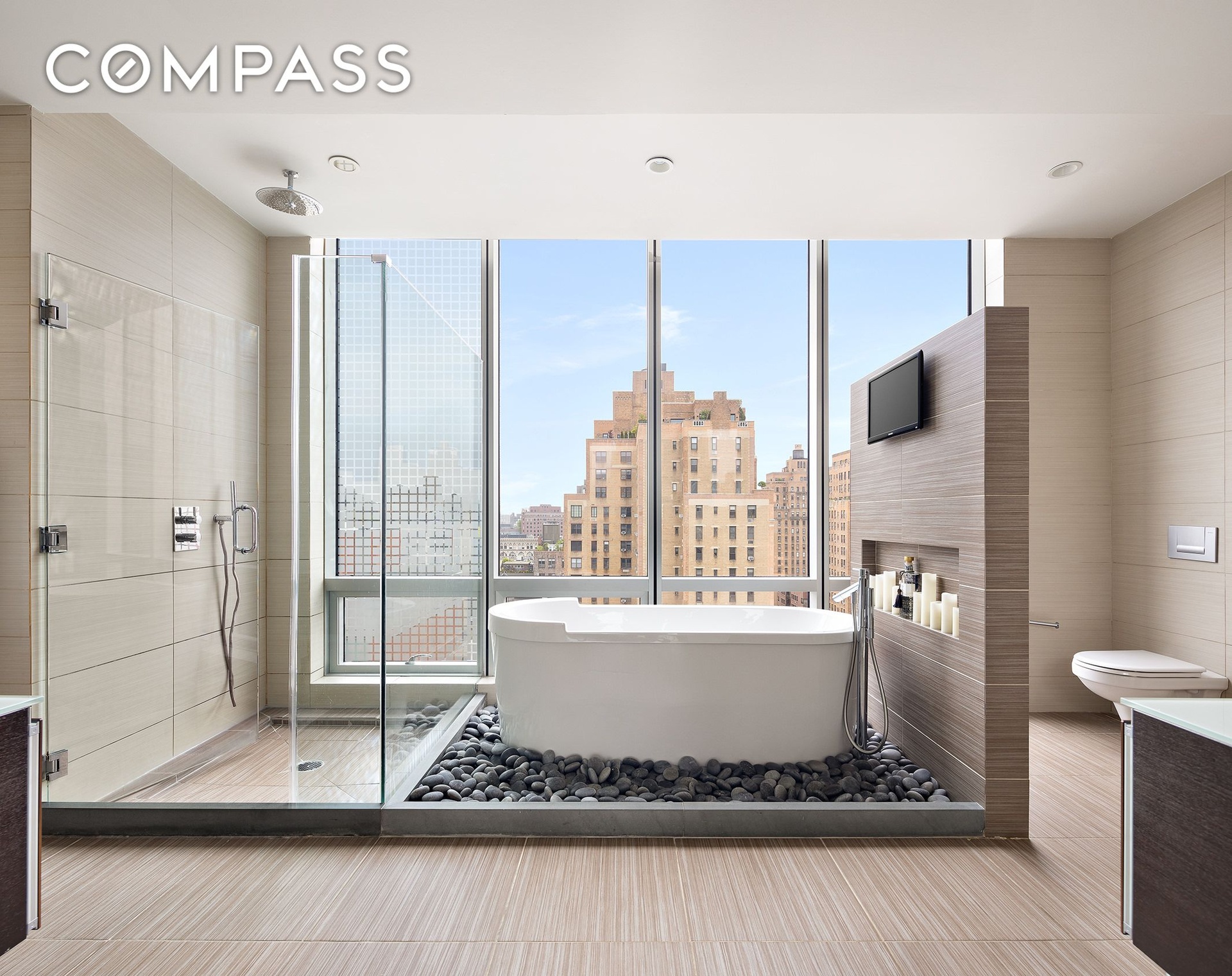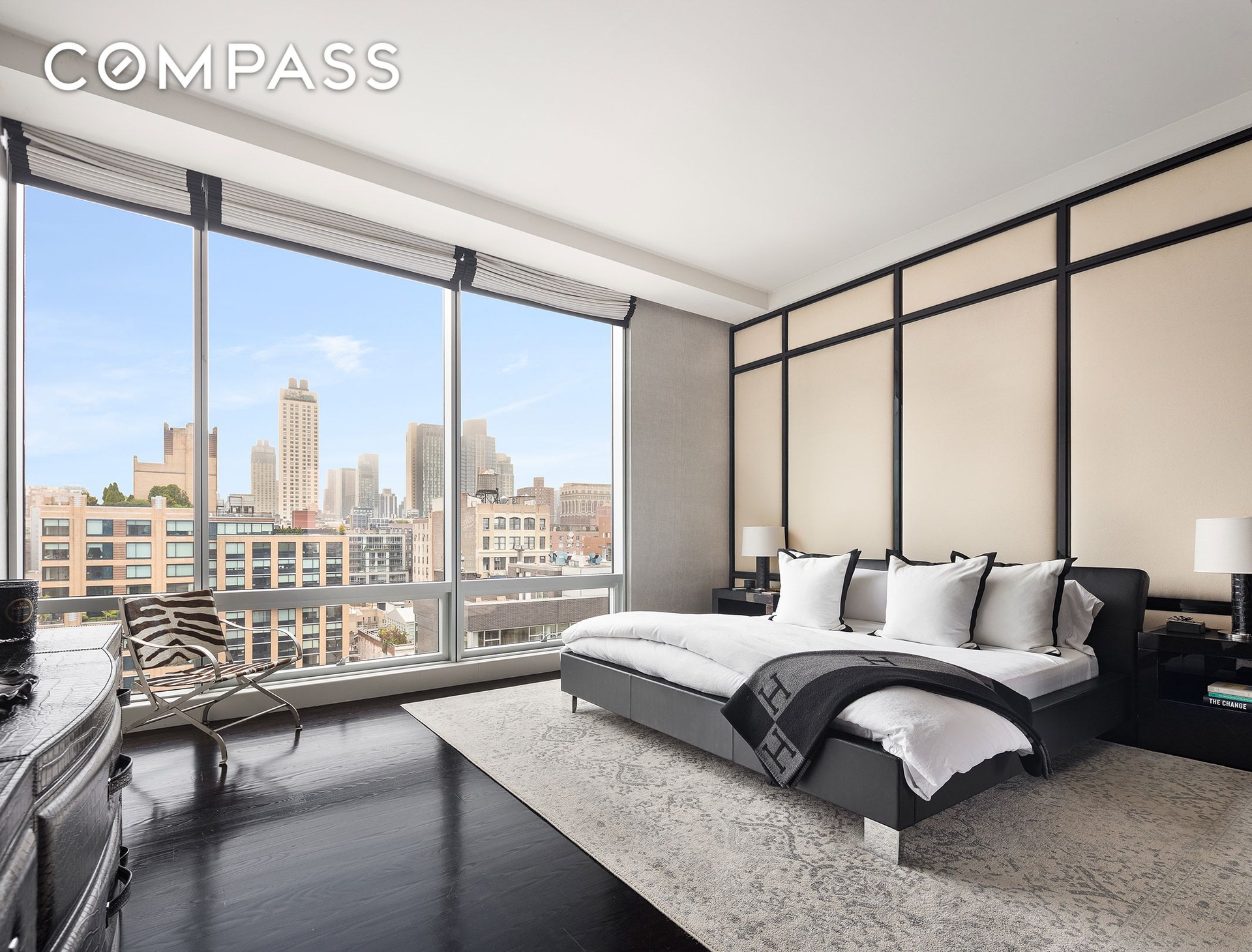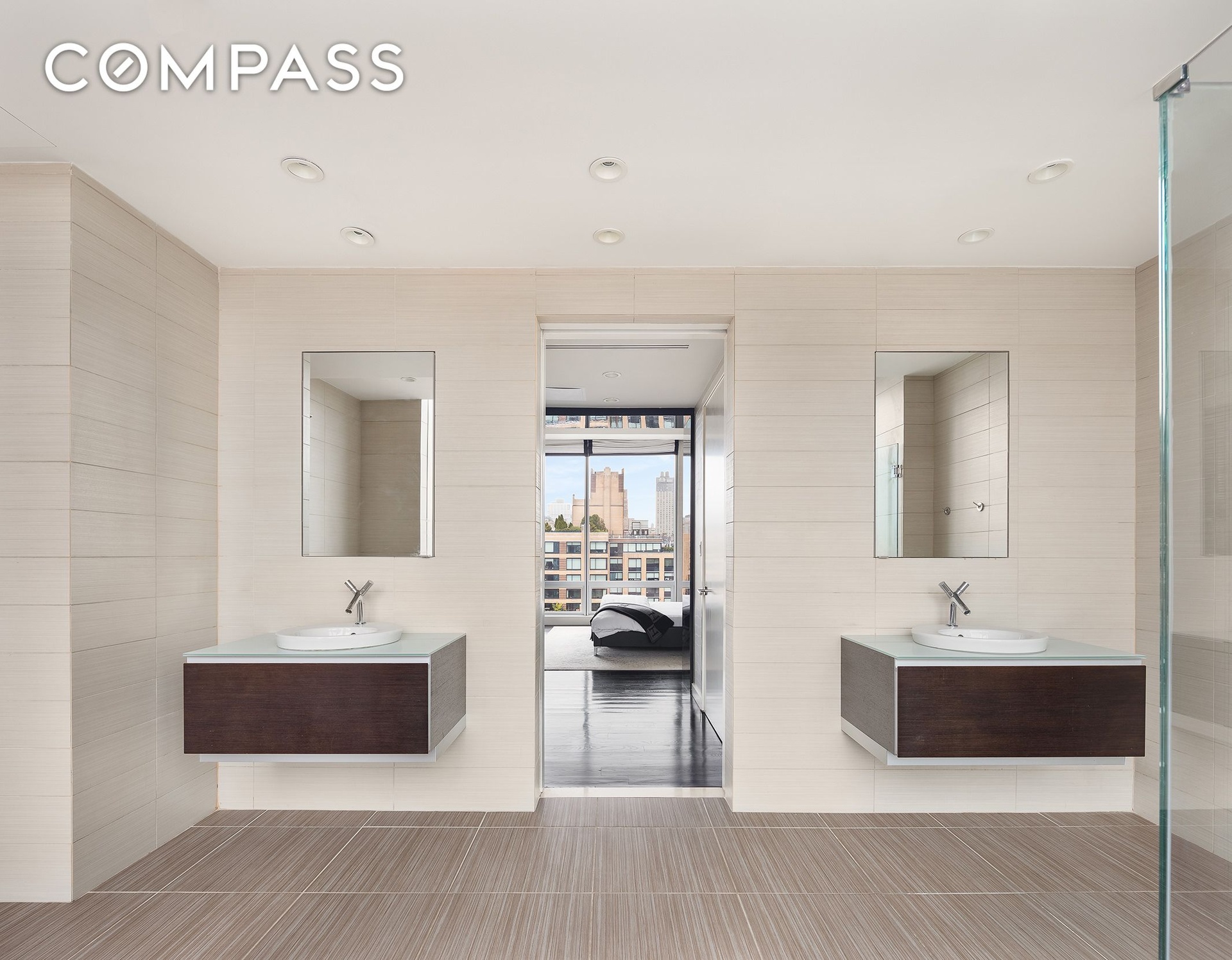 A dramatic stairway leads you up to the second level. All levels are easily accessed with the two building elevators. The mid level houses two bedroom suites both with floor-to-ceiling windows that celebrate the f city views beyond. The primary bedroom suite is grand, accented with customized automatic Roman Shades, a leather padded accent wall and an abundance of custom closets. The ensuite bathroom rivals the world's great Spas with a deep soaking tub surrounded by Zen pebble stones as a centerpiece: a wall of windows acts as the backdrop with southern views all the way down to the World Trade Center. This bathroom is finished with double Valcucine vanities and Duravit sinks, Grohe faucets and fixtures, a separate shower and automated shades. The 2nd bedroom suite has custom mill work and a wall of windows to the North and West.