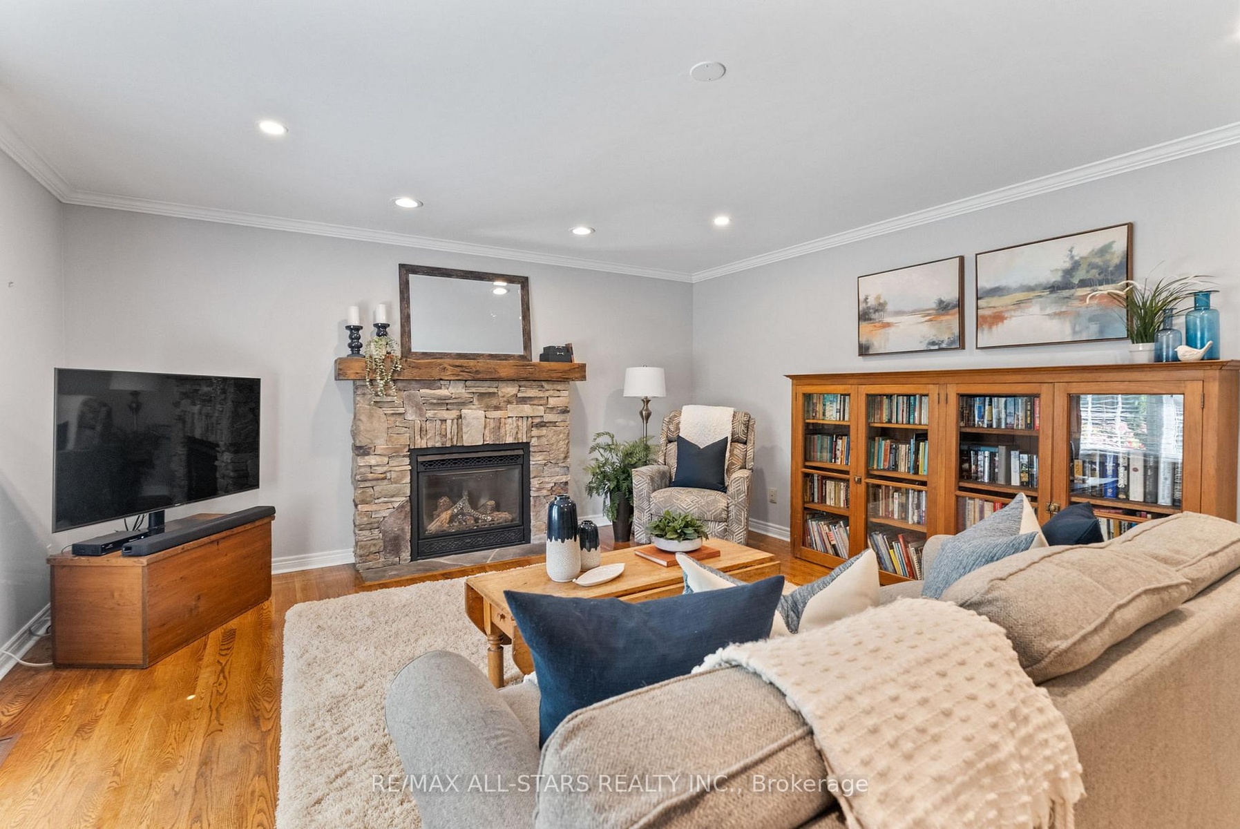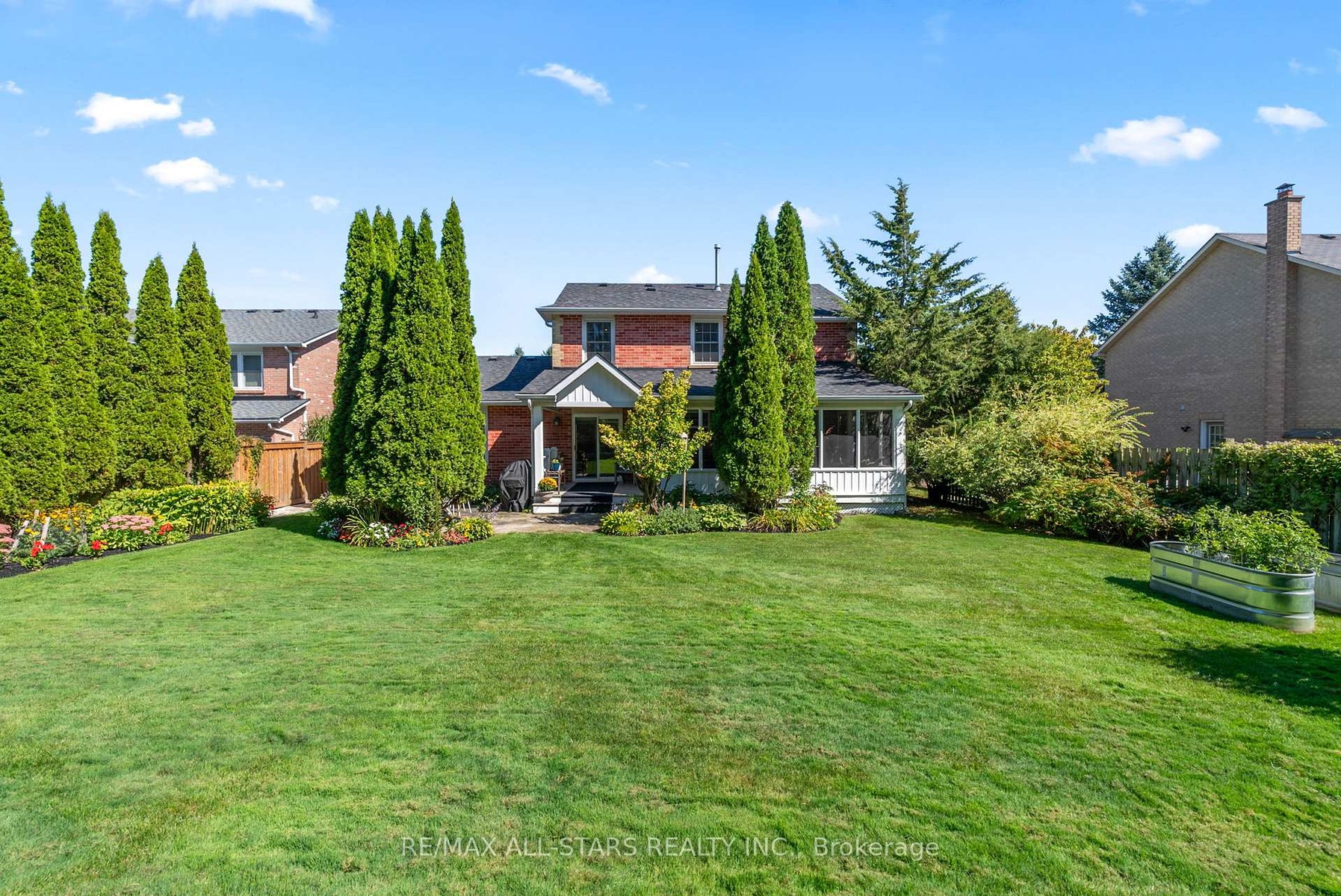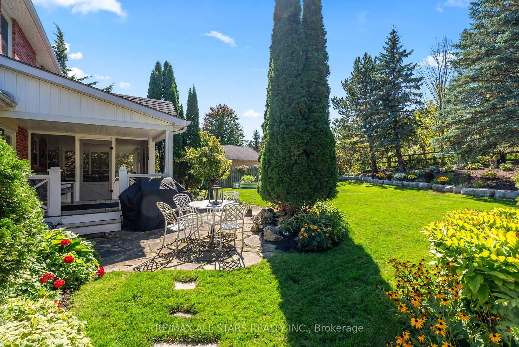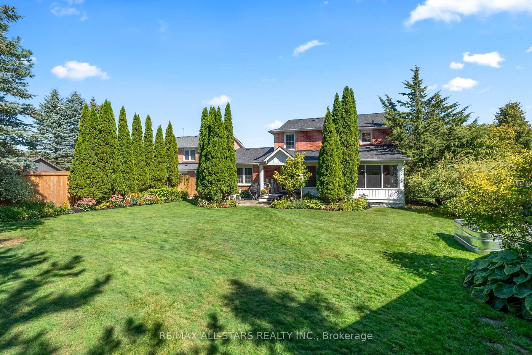 First time offered, this exceptional home, set on a quiet crescent is a picture of sophistication with beautiful updates, a deep covered wraparound porch, 3 season sunroom, meticulous landscaping and custom layout. Nestled on a rare 70 x 169 ft lot backing onto town-designated parkland, enjoy premium privacy and a serene natural backdrop in a sought-after, family-friendly neighbourhood. This elegant home has unmatched curb appeal that hints at the quiet elegance within offering 4 bedrooms, 4 bathrooms and 2,751 sq ft (per MPAC, plus a finished lower level). A beautiful farmhouse kitchen anchors the home with quartz counters, real stone backsplash and breakfast area with patio doors to the deck overlooking perennial gardens enveloped by trees. Refined finishes shine including hardwood floors, crown moulding, smooth ceilings and wainscoting. Off the foyer, a bright office overlooks the front gardens, while the formal living room features a radiant heat gas fireplace for cozy evenings. French doors in the formal dining room open to a 3-season screened sunroom, extending the use of outdoor enjoyment and entertaining, perfect for relaxing while enjoying views of the landscaped, pool-sized backyard and flagstone patio. Upstairs, the principal suite offers hardwood floors, three closets, and a serene ensuite with heated floors, glass shower, and soaker tub. Three additional bedrooms and a stylishly updated main bath complete the upper level. The finished lower level adds valuable space with a den, wet bar, 3-pc bath, and ample storage. Additional features include RainBird irrigation and quality updates including: 2025 Freshly Painted Foyer, Office, Living Room & Upper Hall, 2024 Flagstone Side Walkway, 2023 Furnace & A/C, Lower Level Reno, 2021 Appliances, 2020 Kitchen, Roof Shingles 2019 (Front), 2016 (Rear), Approx. 2014 Windows. Original laundry plumbing remains in mudroom. Steps to schools, parks, and the Uxbridge trail system - this is a rare and refined offering.