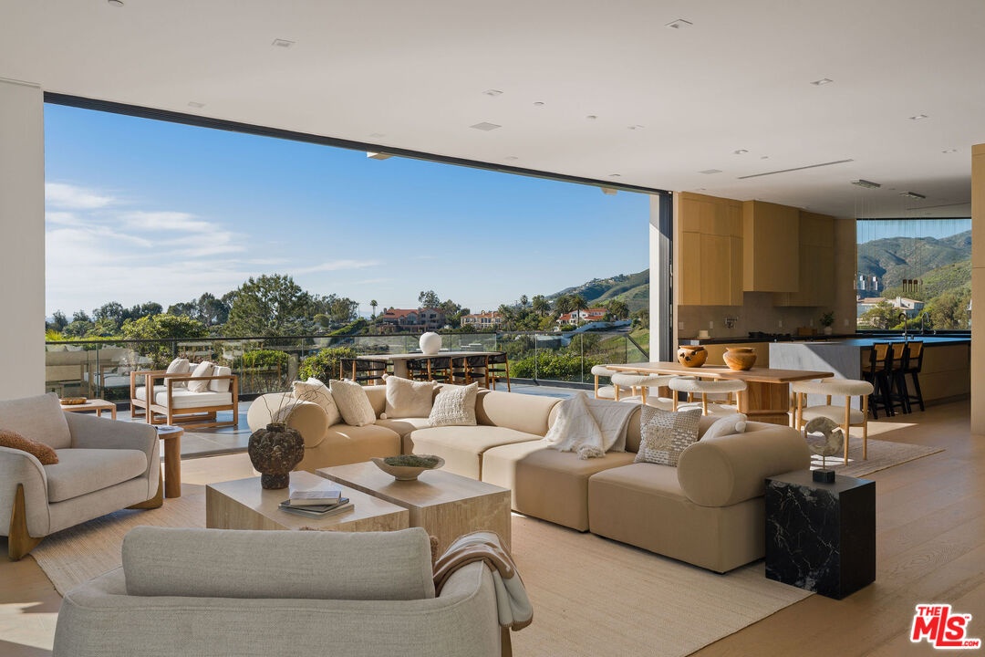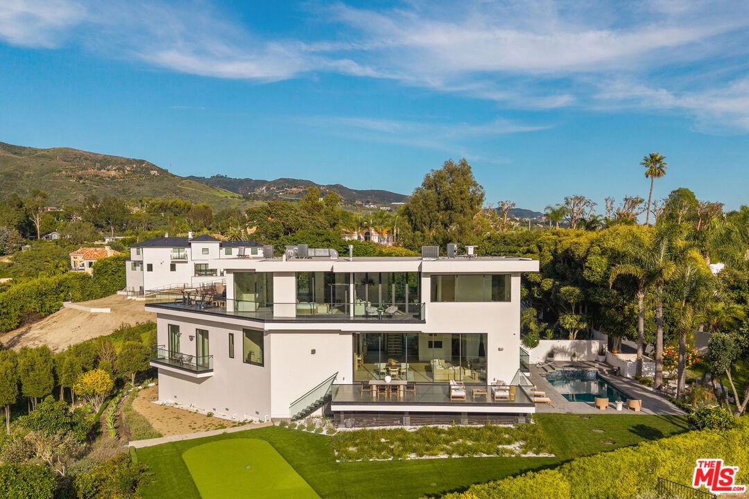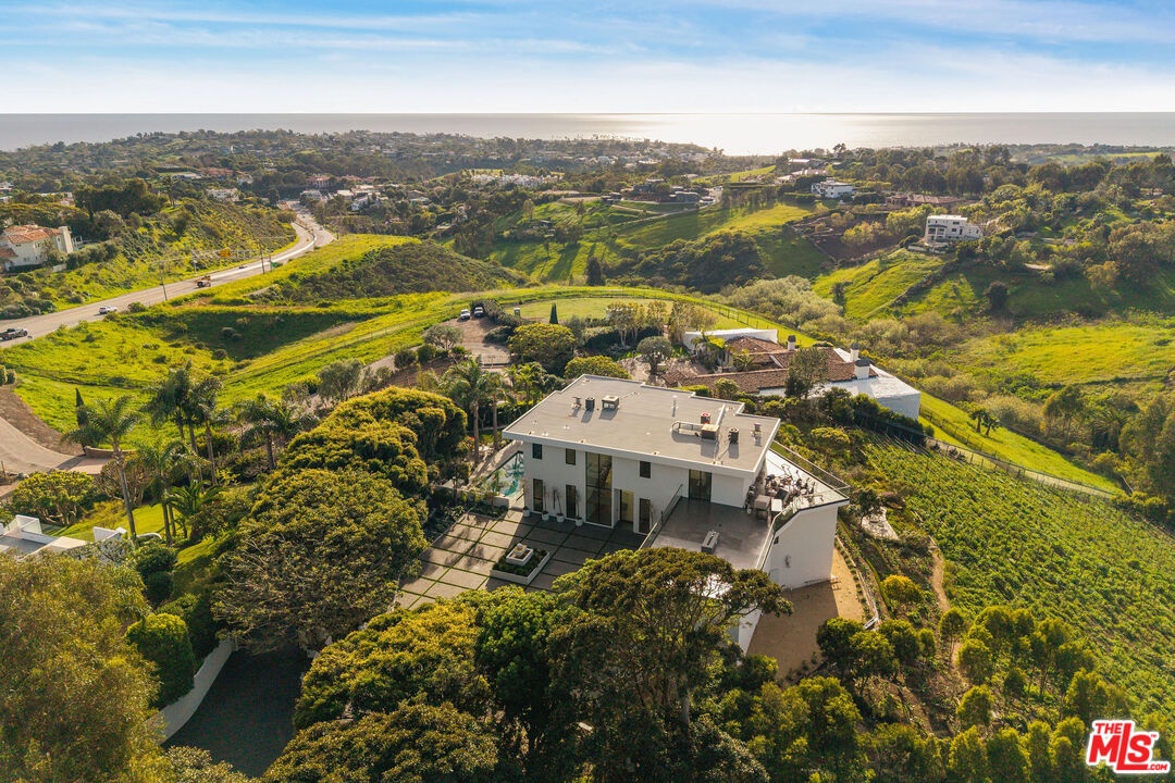 Discover a Malibu New Construction Ocean View estate minutes from Point Dume and set on over 2 acres of spectacular lush landscape and a vineyard. At the end of a private cul de sac, this exceptional Modern Organic luxury estate is a serene compound with commanding views of the Pacific Ocean, rolling vineyards, and the Santa Monica Mountains. From the moment you arrive, the estate makes a statement with its gated and circular motor court and elegant approach that sets the tone for the sophistication within. Soaring ceilings, walls of glass, and expansive open living spaces seamlessly blur the lines between indoors and out, while over 3,000 square feet of wraparound ocean view decks invite you to take in the ever-changing ocean and Tuscany inspired 1 acre vineyard vistas. Every detail of the estate has been carefully curated with the highest level of craftsmanship and design. Fleetwood windows and doors frame dramatic sight lines, while custom white oak built-ins, handmade zellige tiles, and striking stone selections such as Taj Mahal quartzite and leathered granite create a refined, organic palette throughout. The open-concept living area flows effortlessly into the chef's kitchen featuring a 12-foot island clad in leathered stone, top-of-the-line Miele appliances, lime-washed walls, and a large walk-in pantry. The thoughtful floor plan offers five bedrooms and five bathrooms, including two bedrooms on the main level. Upstairs, the primary suite is a true sanctuary with dual closets, a private sitting room, and a spa-inspired bath dressed in Taj Mahal quartzite. The upper level also includes two additional bedrooms and a spacious family lounge designed for relaxed living. An elevator connects both levels with ease. World-class amenities elevate the lifestyle experience, including a state-of-the-art home theater, wine cellar, stylish bar and lounge, and an innovative indoor/outdoor gym that makes fitness a daily indulgence. The outdoor spaces are equally captivating. Resort-like grounds feature a sparkling pool and spa, built-in fire pit, custom barbecue, and an expansive grassy pad of nearly 4,000 square feet with a golf practice area ideal for entertaining, recreation, or simply soaking in the tranquility of your surroundings. The property has been designed for convenience and security, with a four-car garage, video intercom system, and ample additional parking for over 10 vehicles, including space for an Airstream or boat via private side yard access. This new construction secluded estate by architect Itay Mane represents a rare opportunity to own an ocean view retreat in Malibu, complete with a uniquely picturesque vineyard, perfectly positioned near Point Dume and Malibu beachside conveniences.