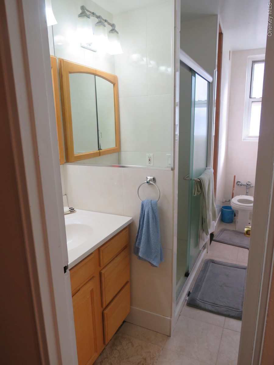 - Full bath with vanity, a bidet, light tile patterned floors, and a stall shower