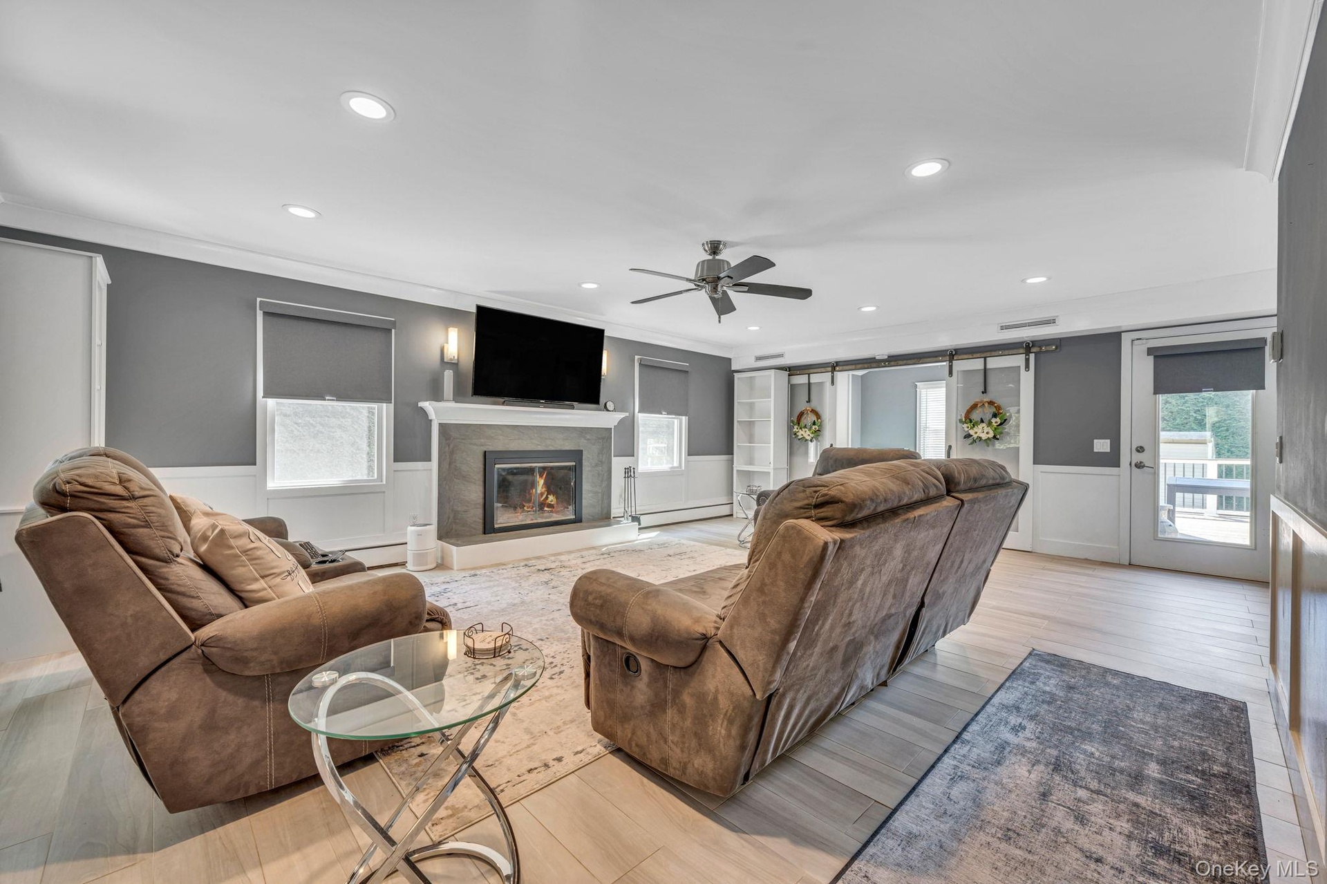 - Living area featuring wainscoting, plenty of natural light, ceiling fan, wood finished floors, and a fireplace