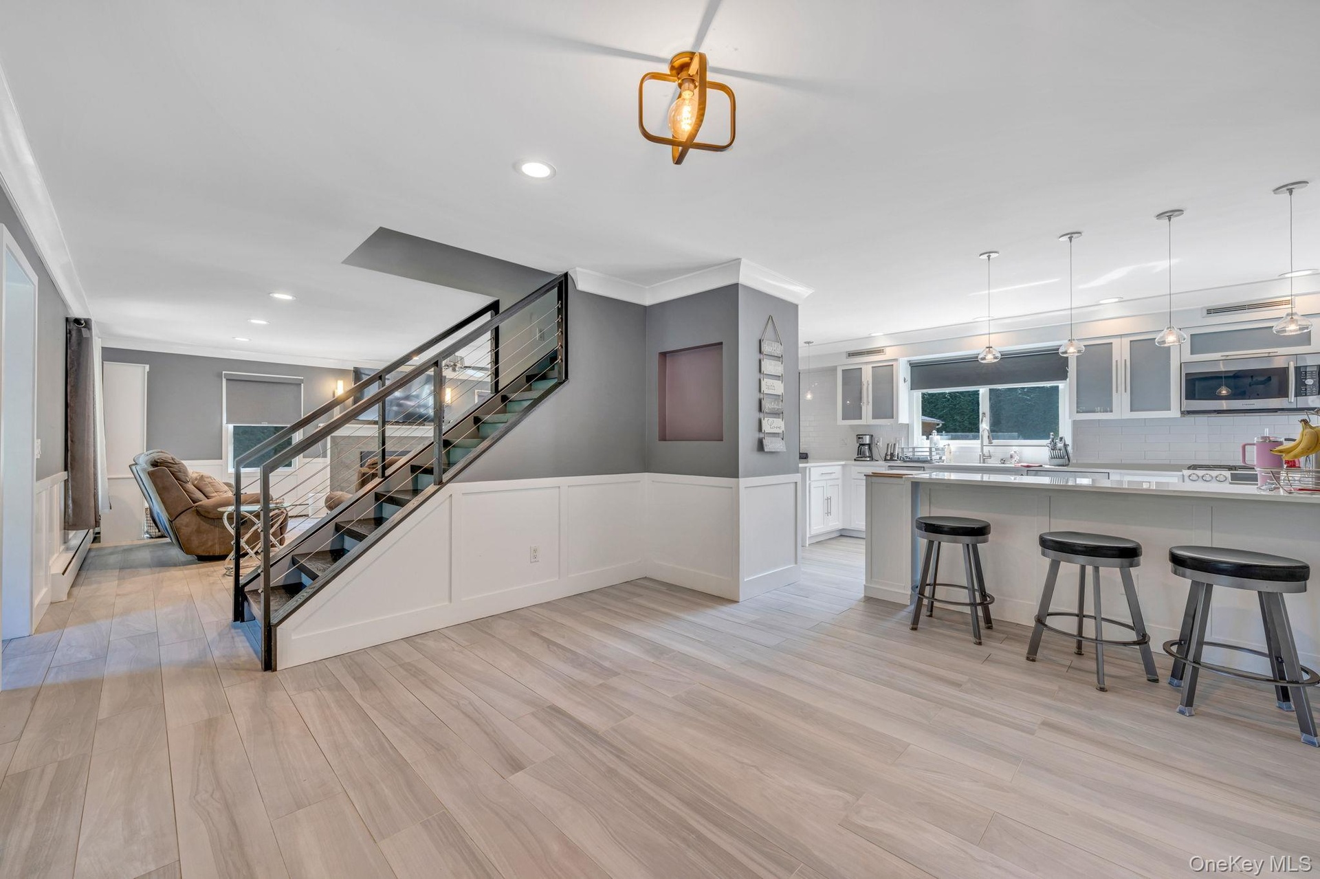 - Living area featuring light wood-style floors, wainscoting, stairs, a decorative wall, and baseboard heating