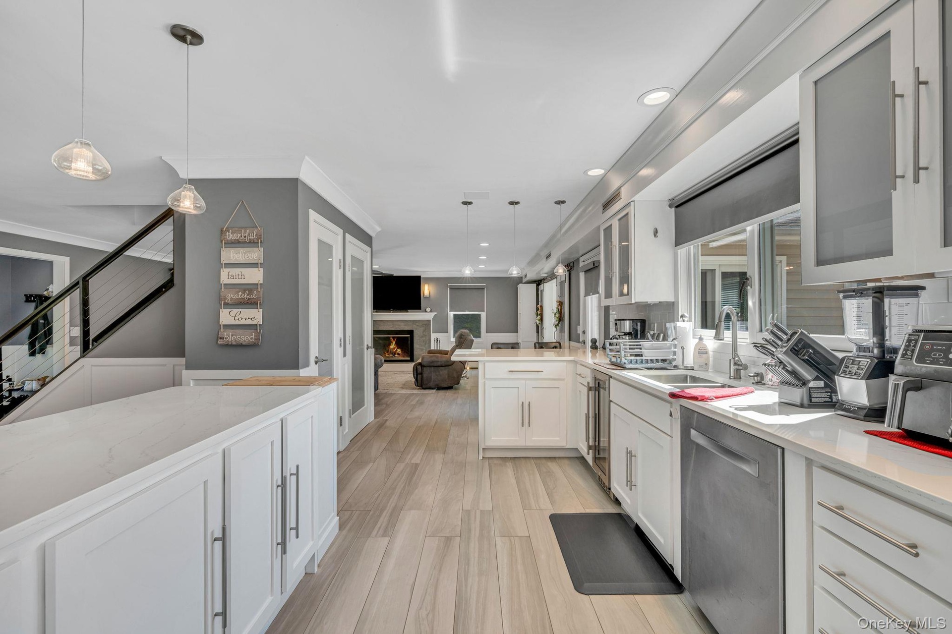 - Kitchen featuring hanging light fixtures, white cabinets, dishwasher, glass insert cabinets, and open floor plan
