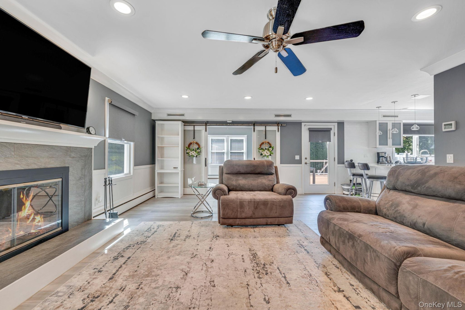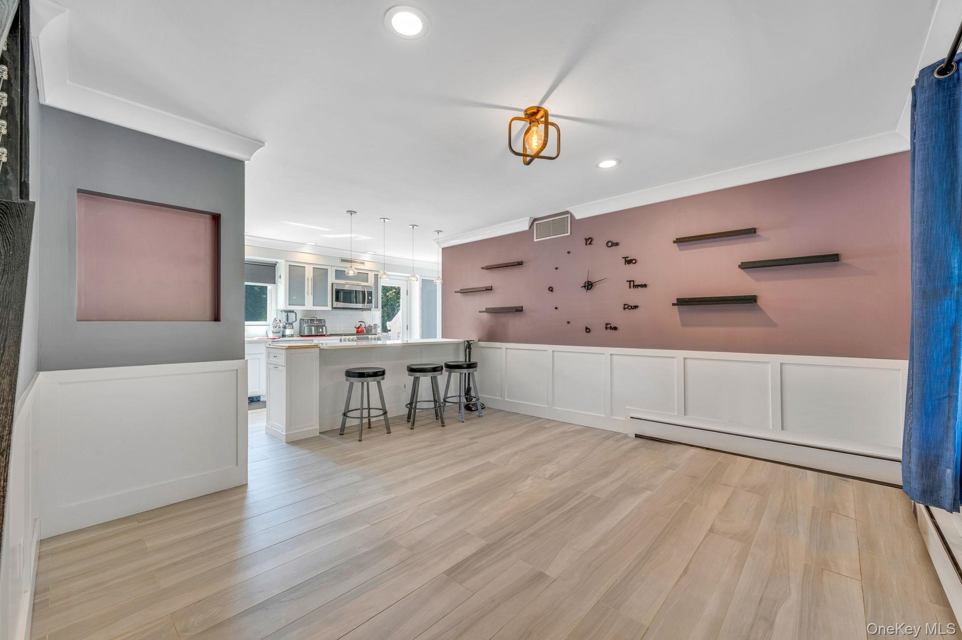 - Living room with a baseboard heating unit, light wood-style floors, ornamental molding, a decorative wall, and recessed lighting