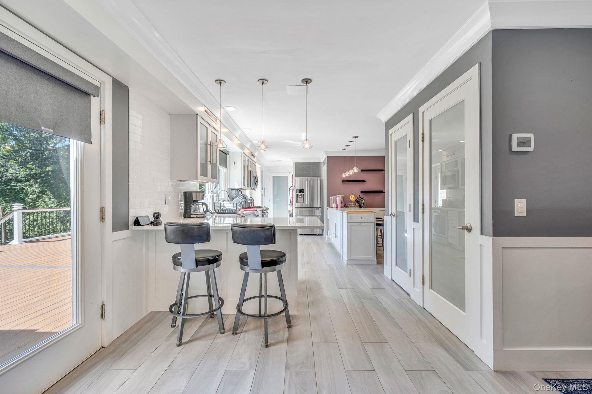 - Kitchen featuring white cabinetry, light countertops, a breakfast bar, a peninsula, and stainless steel fridge with ice dispenser