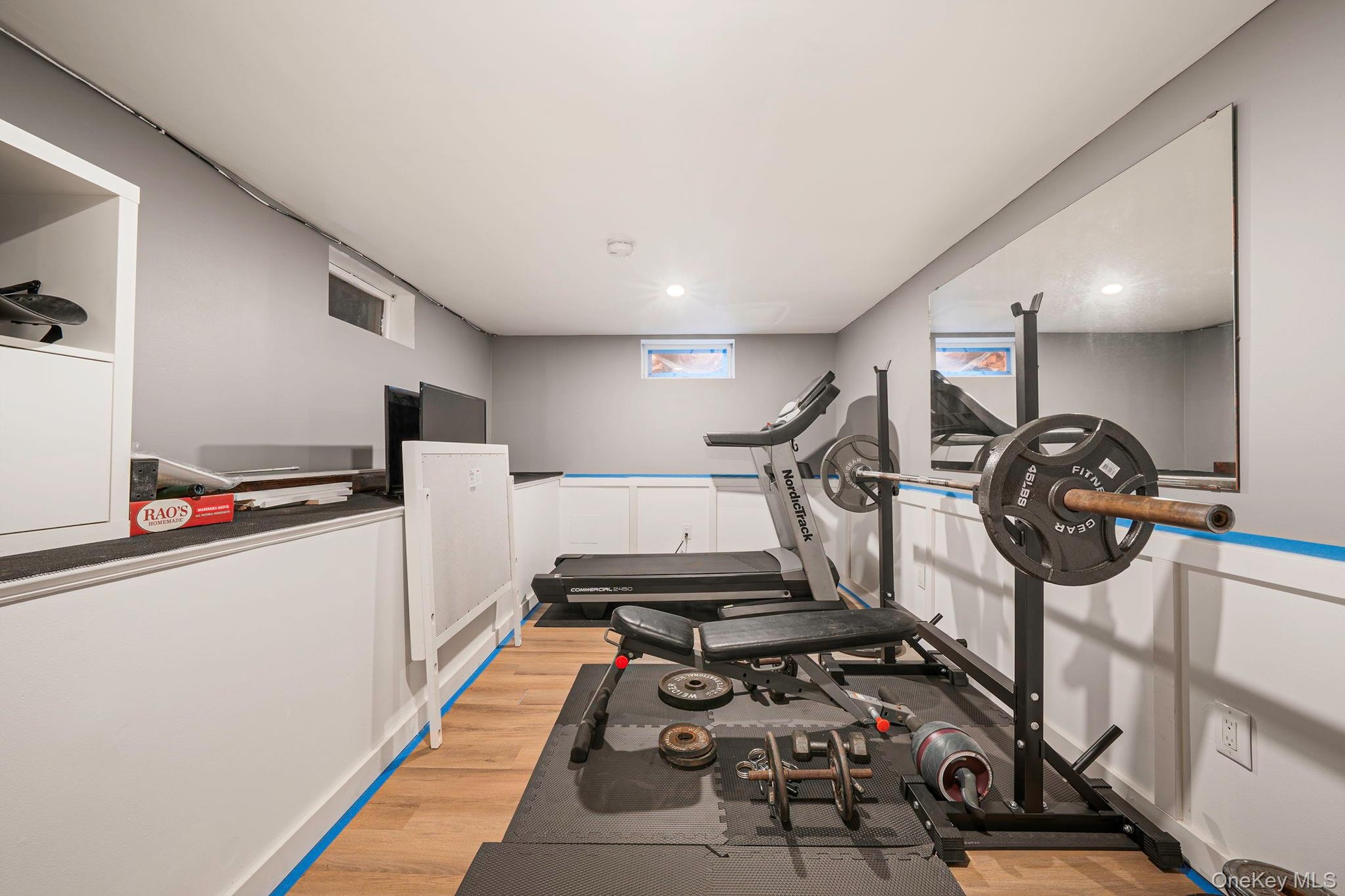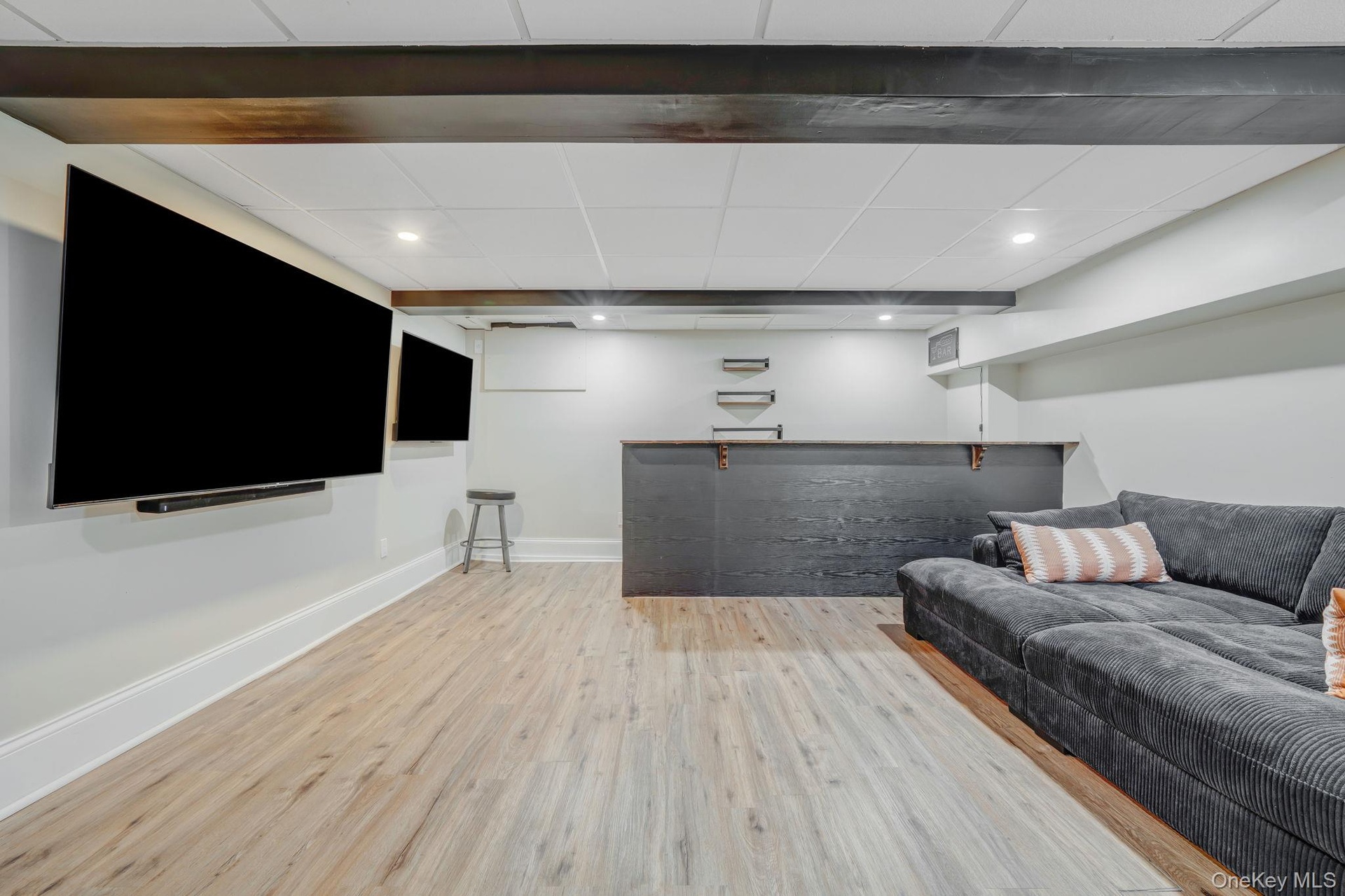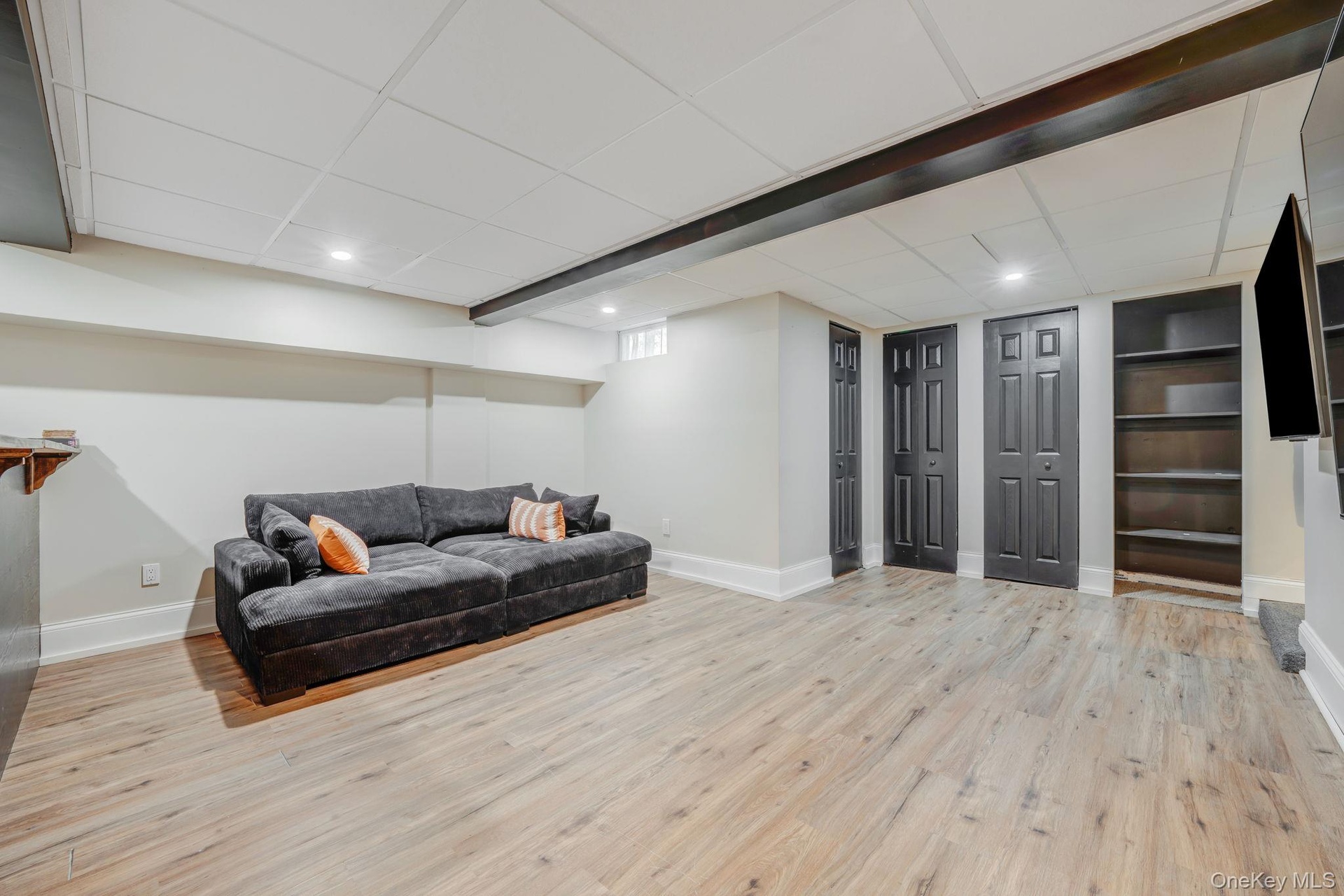 - Living area featuring a drop ceiling, light wood-style flooring, and recessed lighting