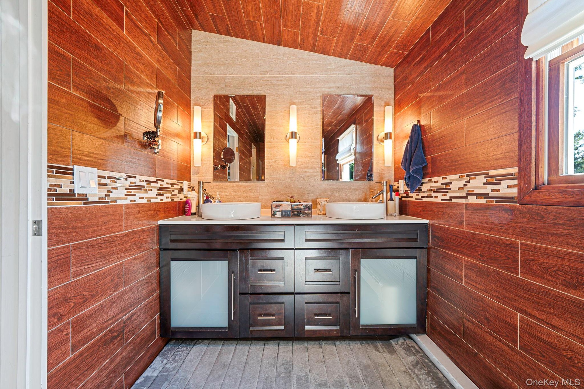 - Full bathroom featuring double vanity, vaulted ceiling, and tile walls