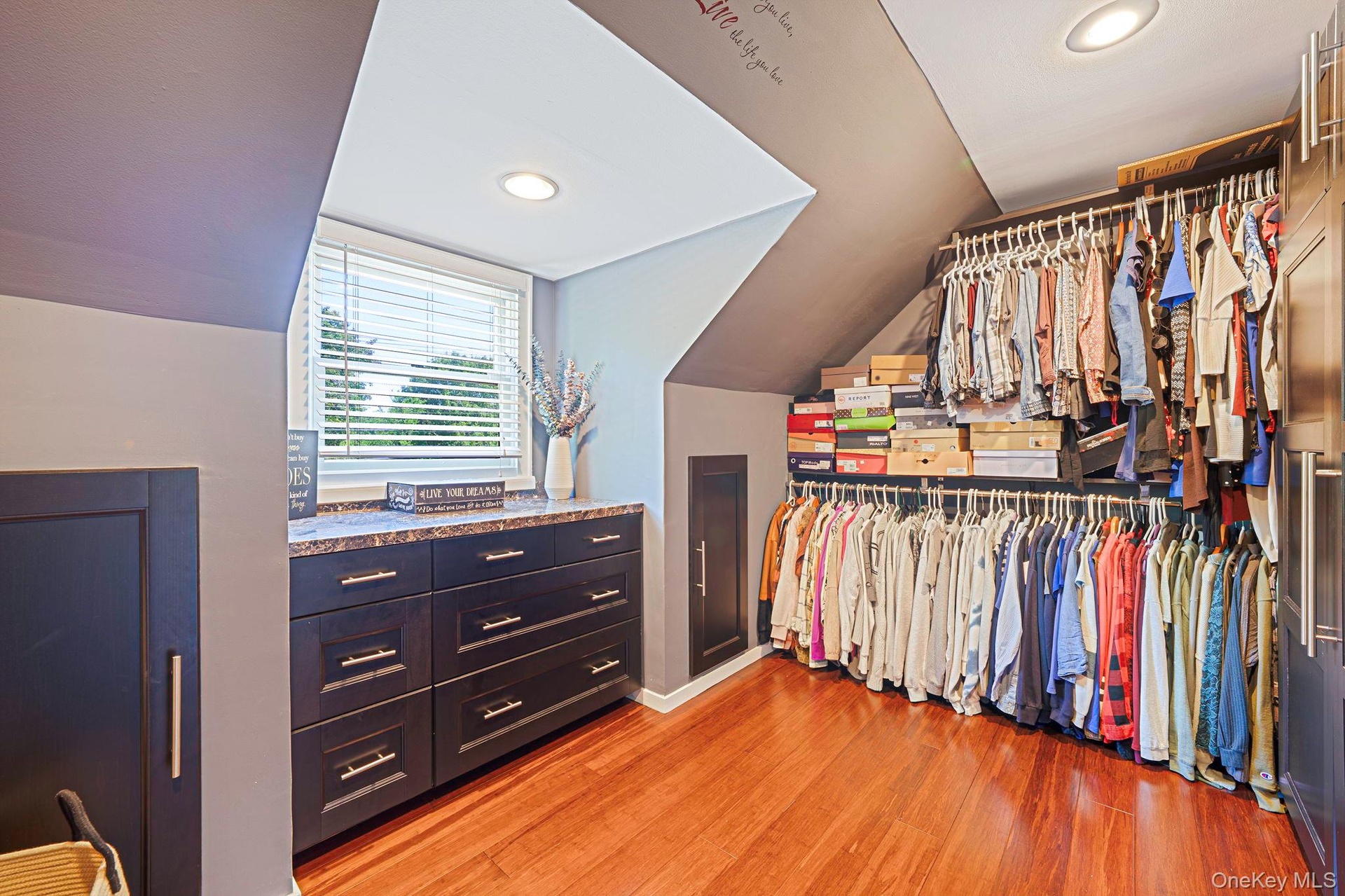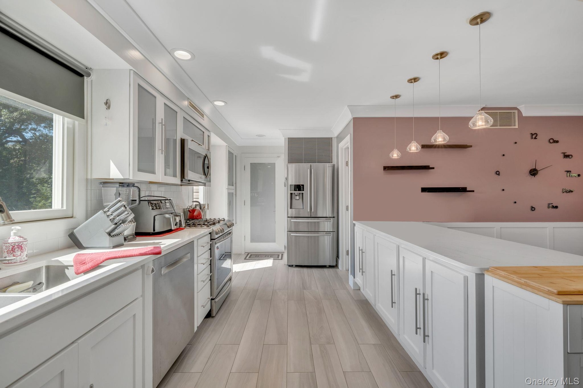- Kitchen featuring white cabinets, stainless steel appliances, hanging light fixtures, glass insert cabinets, and wood finish floors