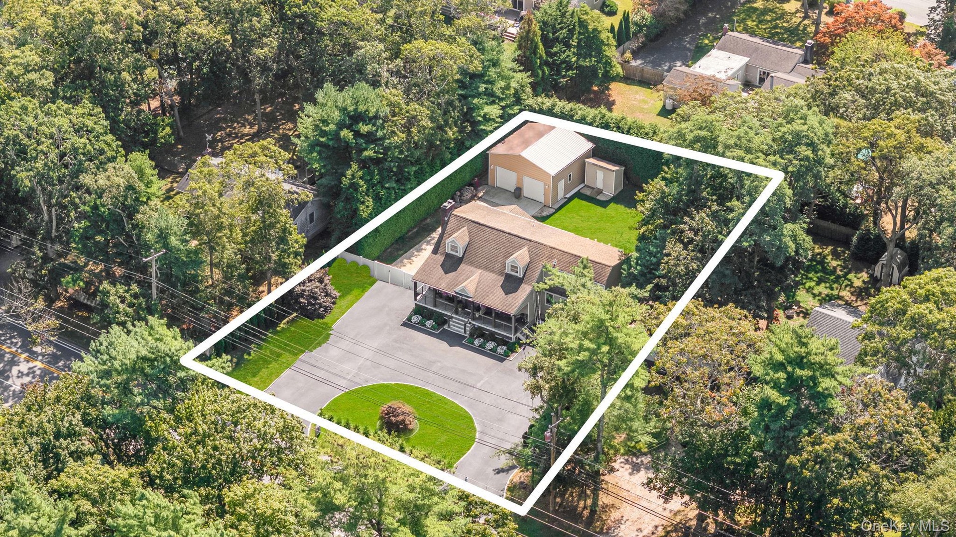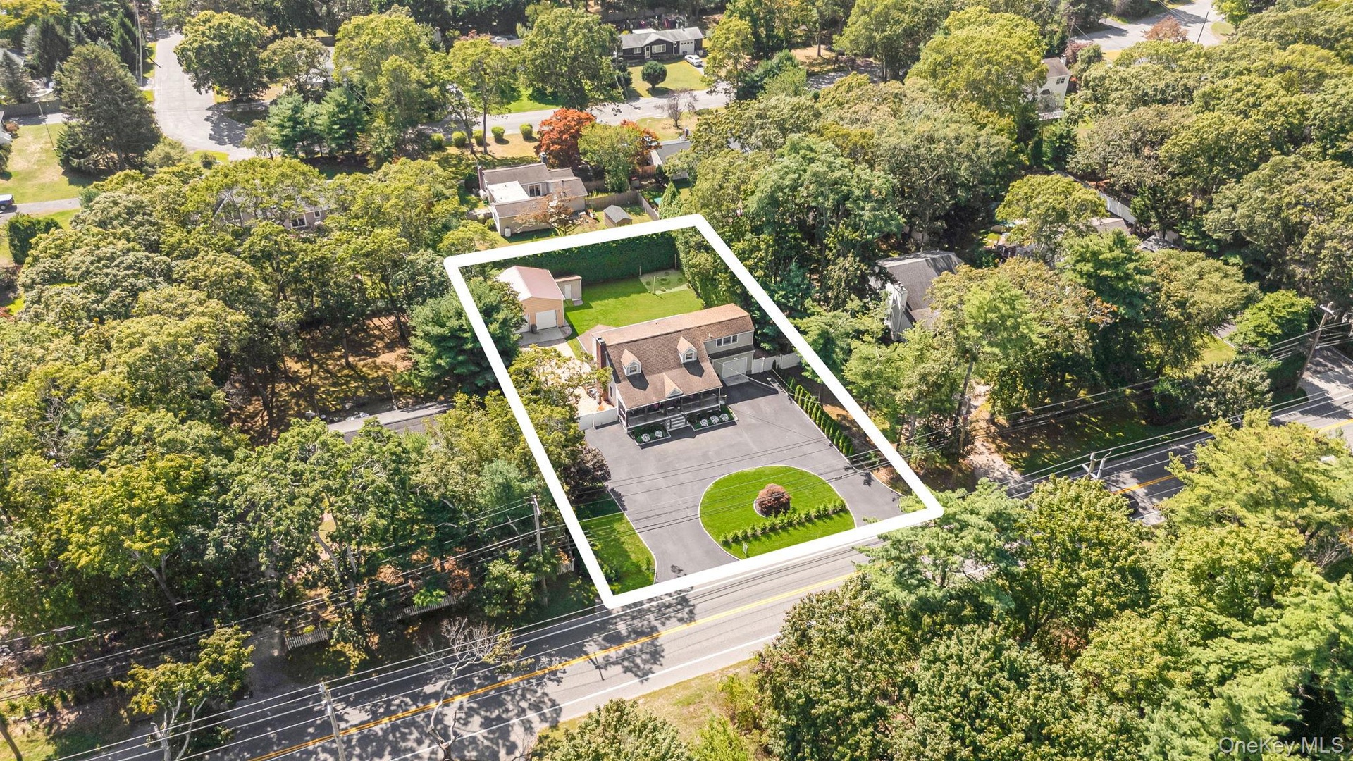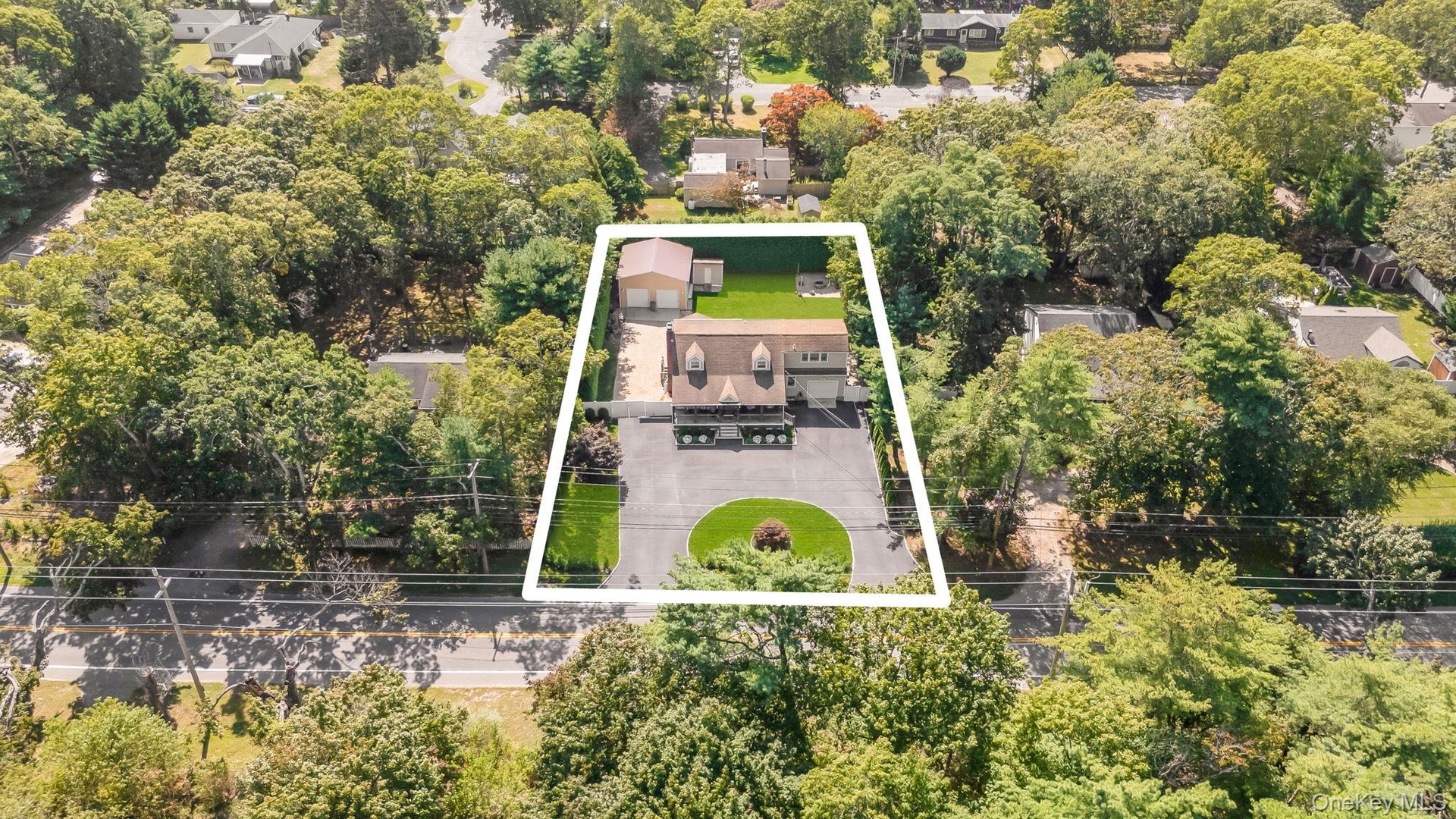 - Aerial view of residential area with property parcel outlined and a tree filled landscape