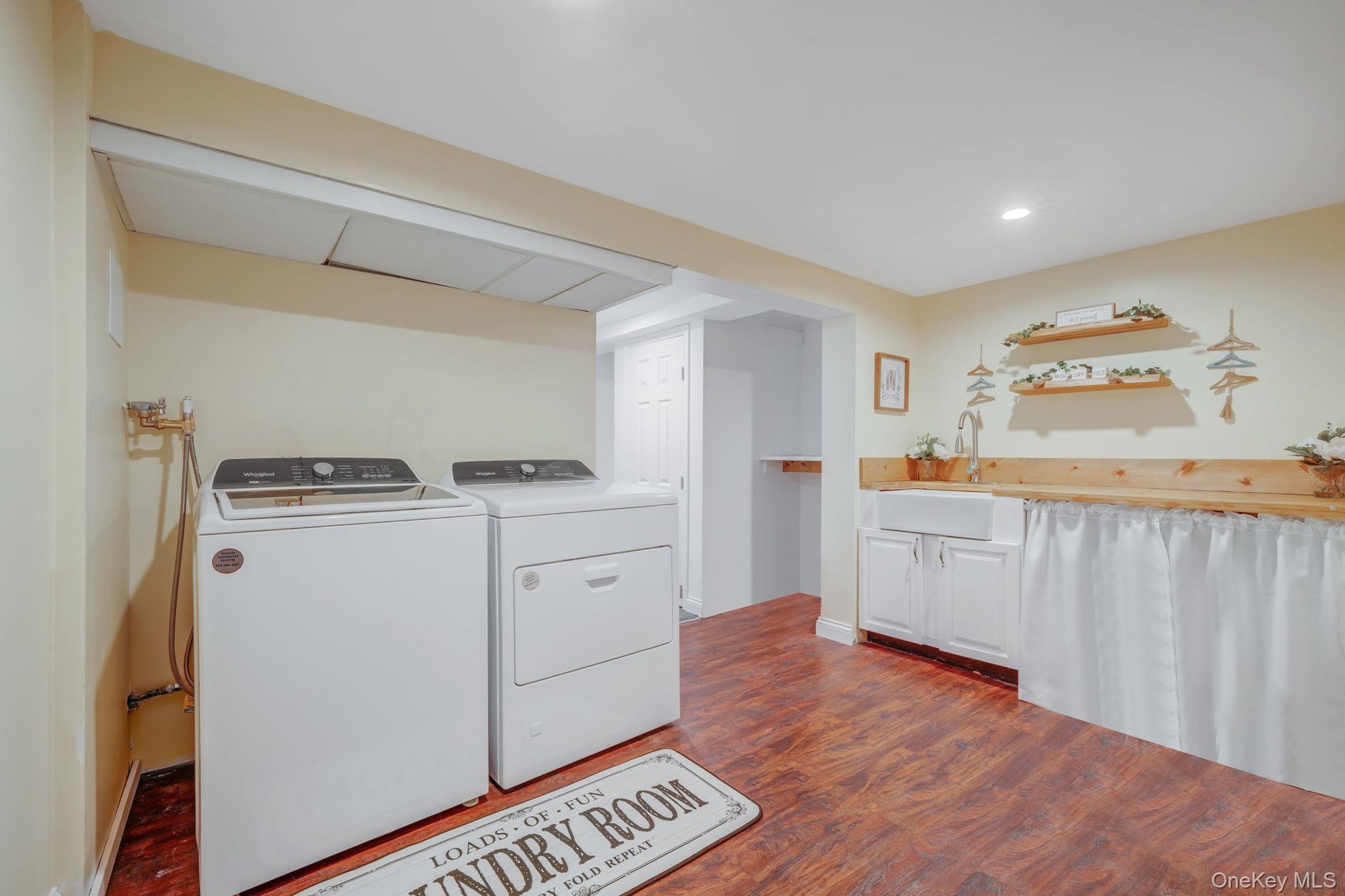 - Washroom with dark wood finished floors, washing machine and clothes dryer, and recessed lighting