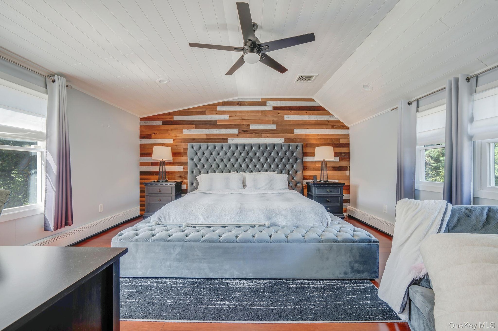 - Bedroom with wooden walls, vaulted ceiling, wood finished floors, and a ceiling fan