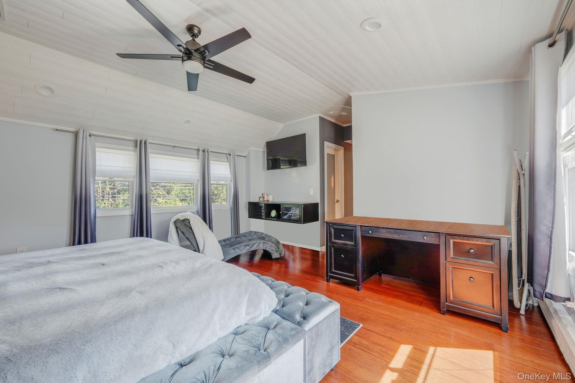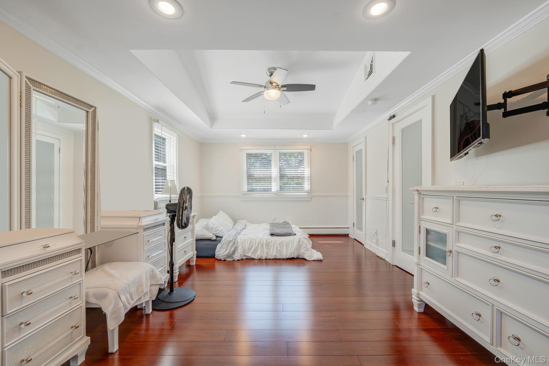 - Bedroom with ornamental molding, dark wood-type flooring, a ceiling fan, a raised ceiling, and baseboard heating