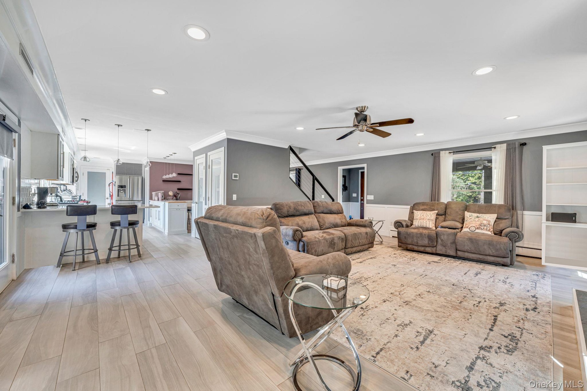 - Living area featuring crown molding, recessed lighting, stairs, light wood-style floors, and a ceiling fan