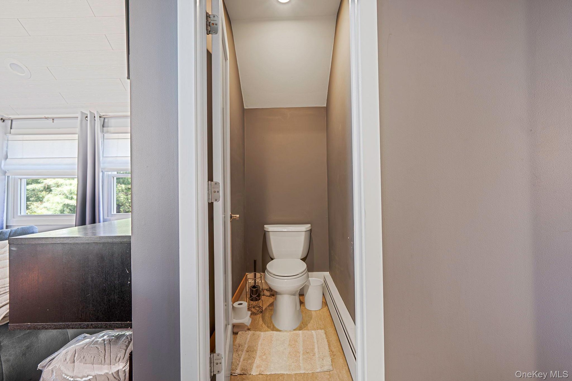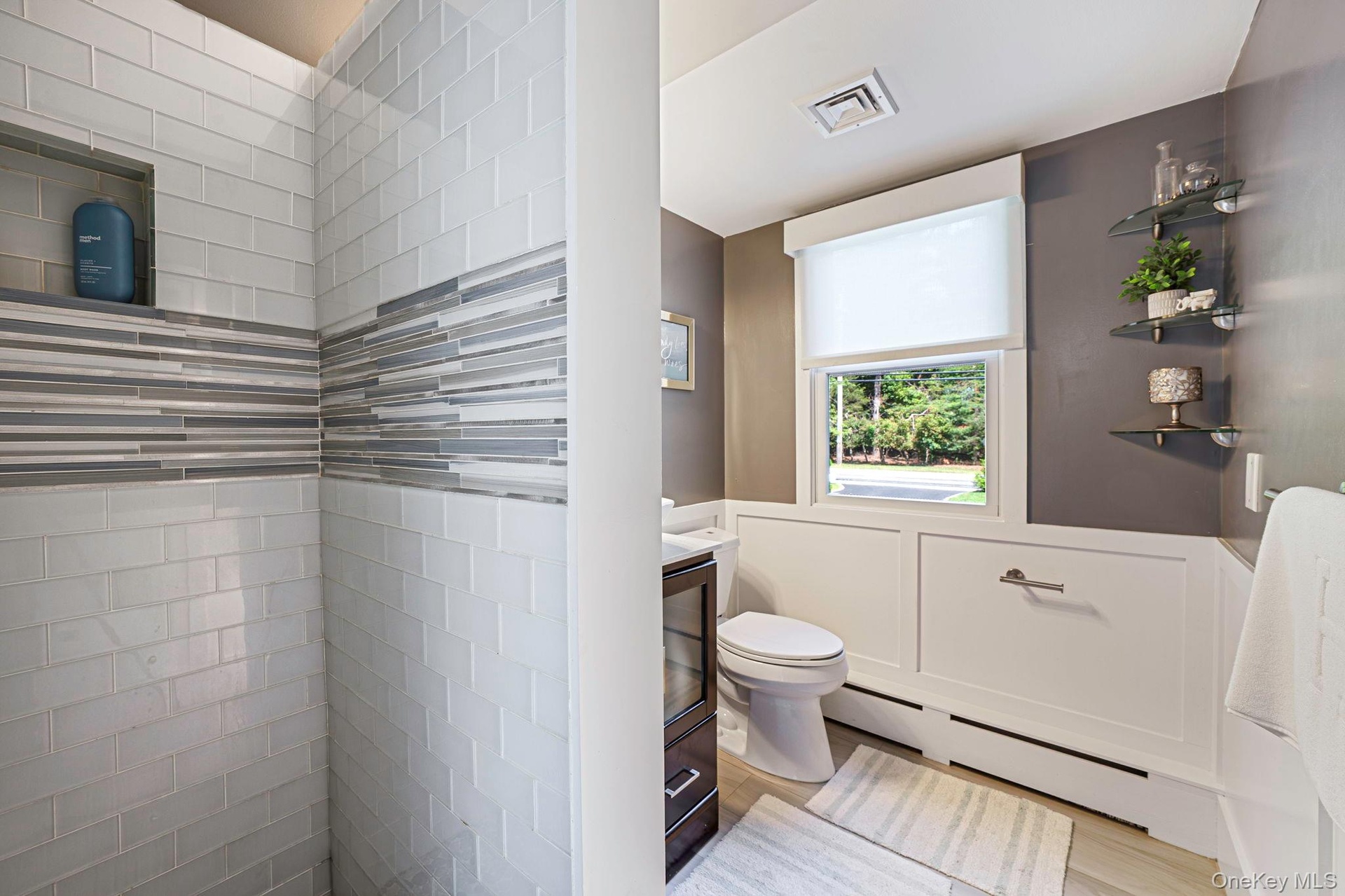 - Half bath featuring vanity, a wainscoted wall, a decorative wall, and a baseboard radiator