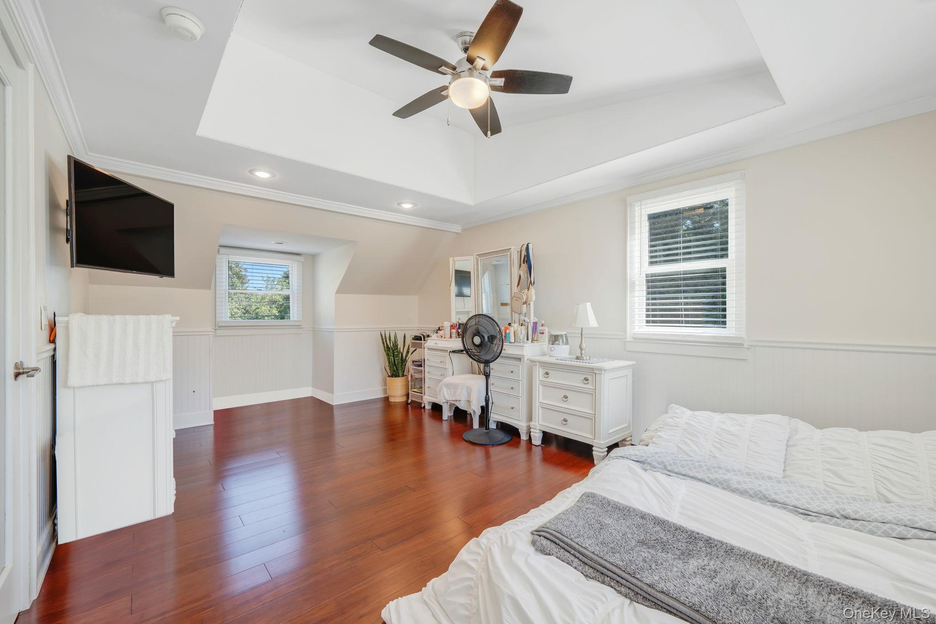 - Bedroom with a raised ceiling, dark wood-style flooring, wainscoting, ornamental molding, and ceiling fan