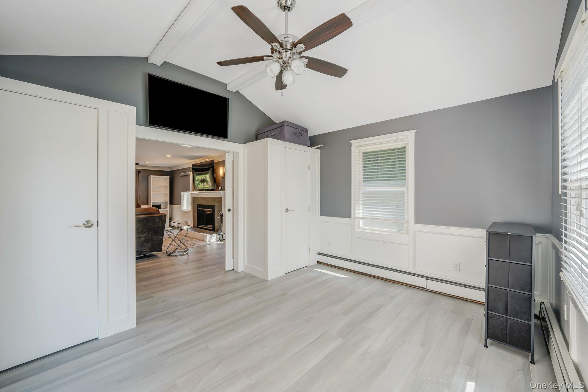 - Unfurnished bedroom featuring a baseboard heating unit, access to outside, wainscoting, a decorative wall, and a ceiling fan