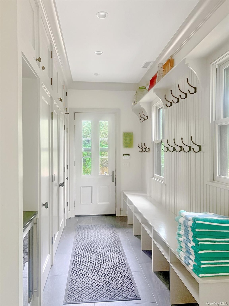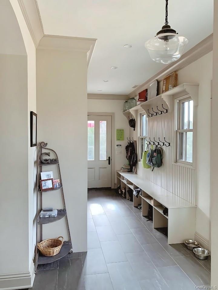 - Mudroom featuring ornamental molding and tile patterned flooring