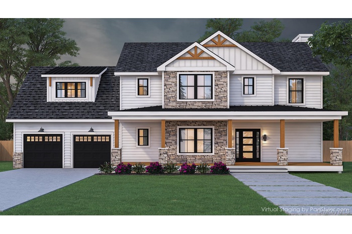 Beautiful new construction being built in Ridgebury Estates, a new community of carefully crafted colonials perched high on a hill with tree-lined streets, stone walls and lots of open space. Situated in the heart of Orange County, NY and in the highly sought-after Minisink Valley School District. The Amanda II, a beautifully crafted new construction home that blends modern style with thoughtful design. Featuring four bedrooms and 2.5 bathrooms, this home offers comfort, functionality, and high-end finishes throughout. Step into the bright and inviting main level, where red oak hardwood floors flow through the open-concept living areas. The spacious living room is anchored by a warm fireplace, creating a perfect space for relaxation and entertaining. The chef-inspired kitchen is outfitted with custom cabinetry, quartz countertops, a stylish tile backsplash and a center island ideal for casual dining or morning coffee. All four bedrooms are located on the upper level and feature plush wall-to-wall carpeting for comfort and warmth. The primary suite is a true retreat with vaulted ceilings, a private bath, walk-in closet, and ample natural light. Additional bedrooms offer generous closets, and there's a second full bath conveniently located nearby. Additional highlights include central A/C, a laundry room, and tray ceilings that add an elegant architectural touch. Enjoy outdoor living on the charming covered front porch with stone accents, enhancing the home’s curb appeal.