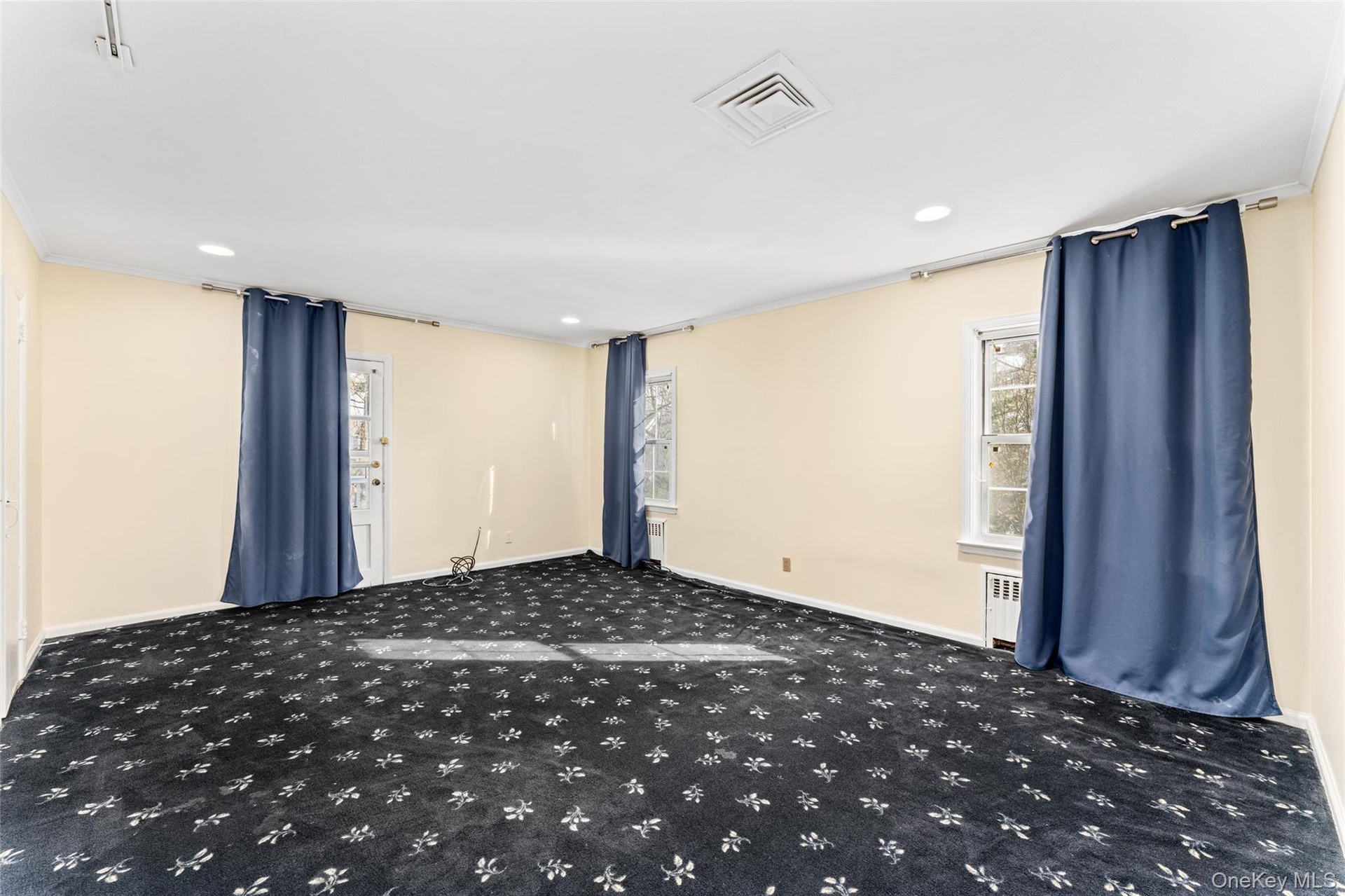 - Carpeted spare room with recessed lighting, radiator heating unit, and crown molding