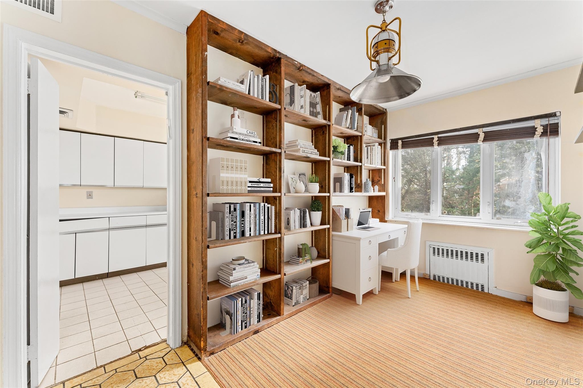 - Living area with radiator, light tile patterned flooring, crown molding, and an office area