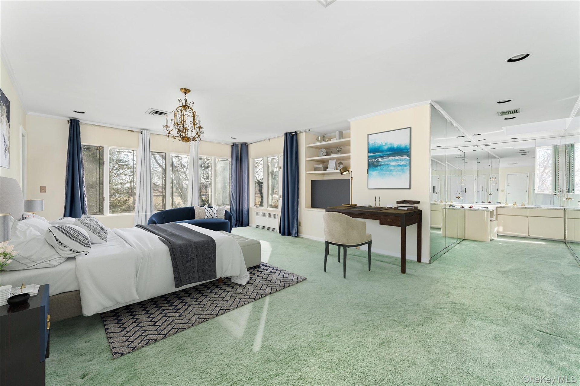 - Bedroom featuring light colored carpet, multiple windows, and a chandelier