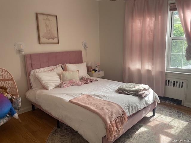 - Bedroom featuring radiator and wood finished floors