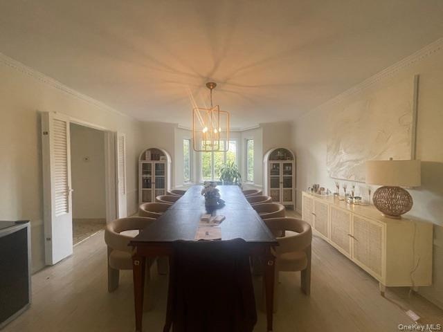 - Dining room featuring crown molding, wood finished floors, and a chandelier