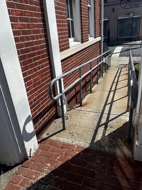 - View of property exterior with a chimney, a porch, brick siding, and a gate