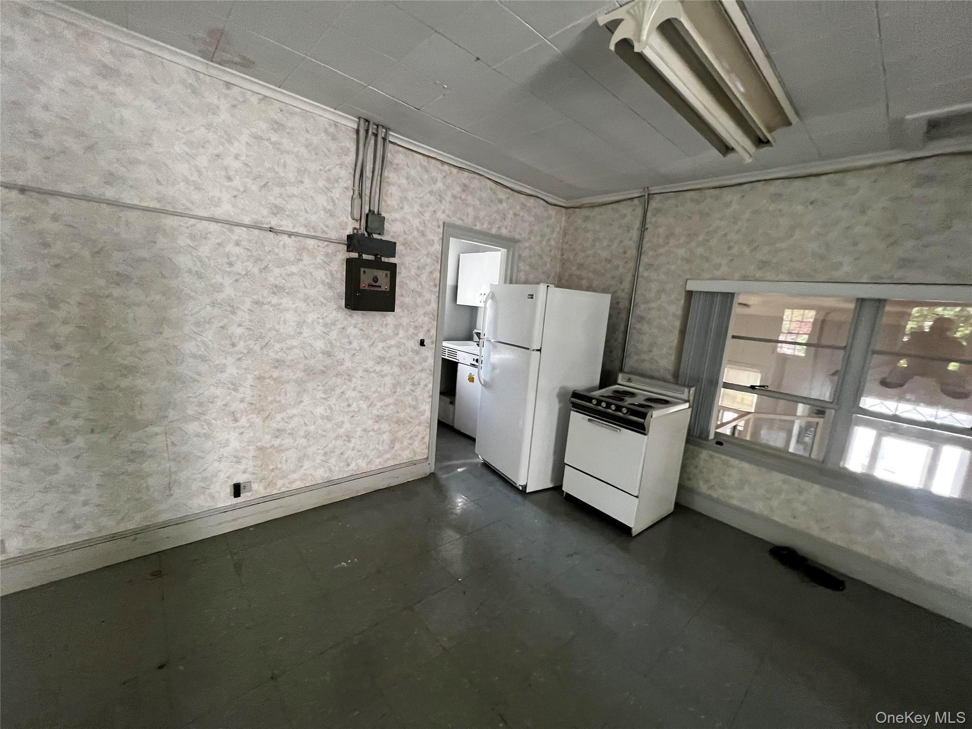 - Unfurnished living room with healthy amount of natural light, wallpapered walls, and concrete floors