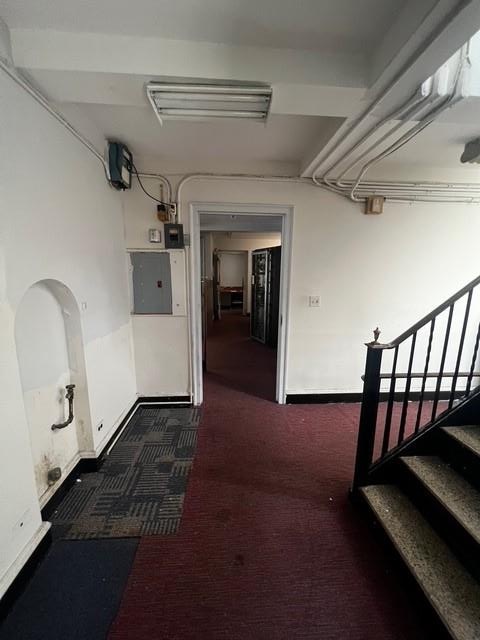 - Hallway featuring electric panel, stairs, and dark colored carpet