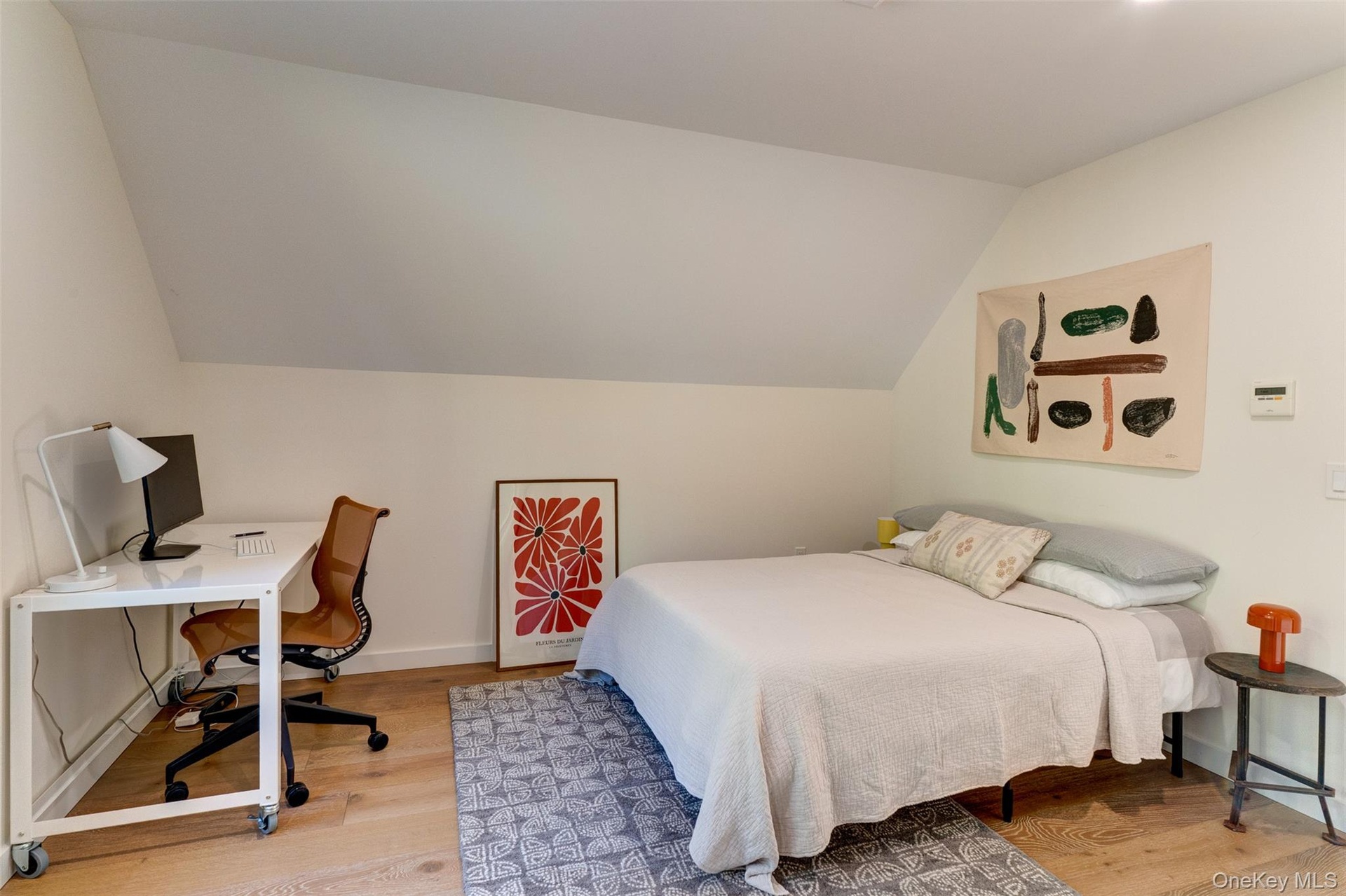 - Bedroom with light wood-style flooring, lofted ceiling, and a desk