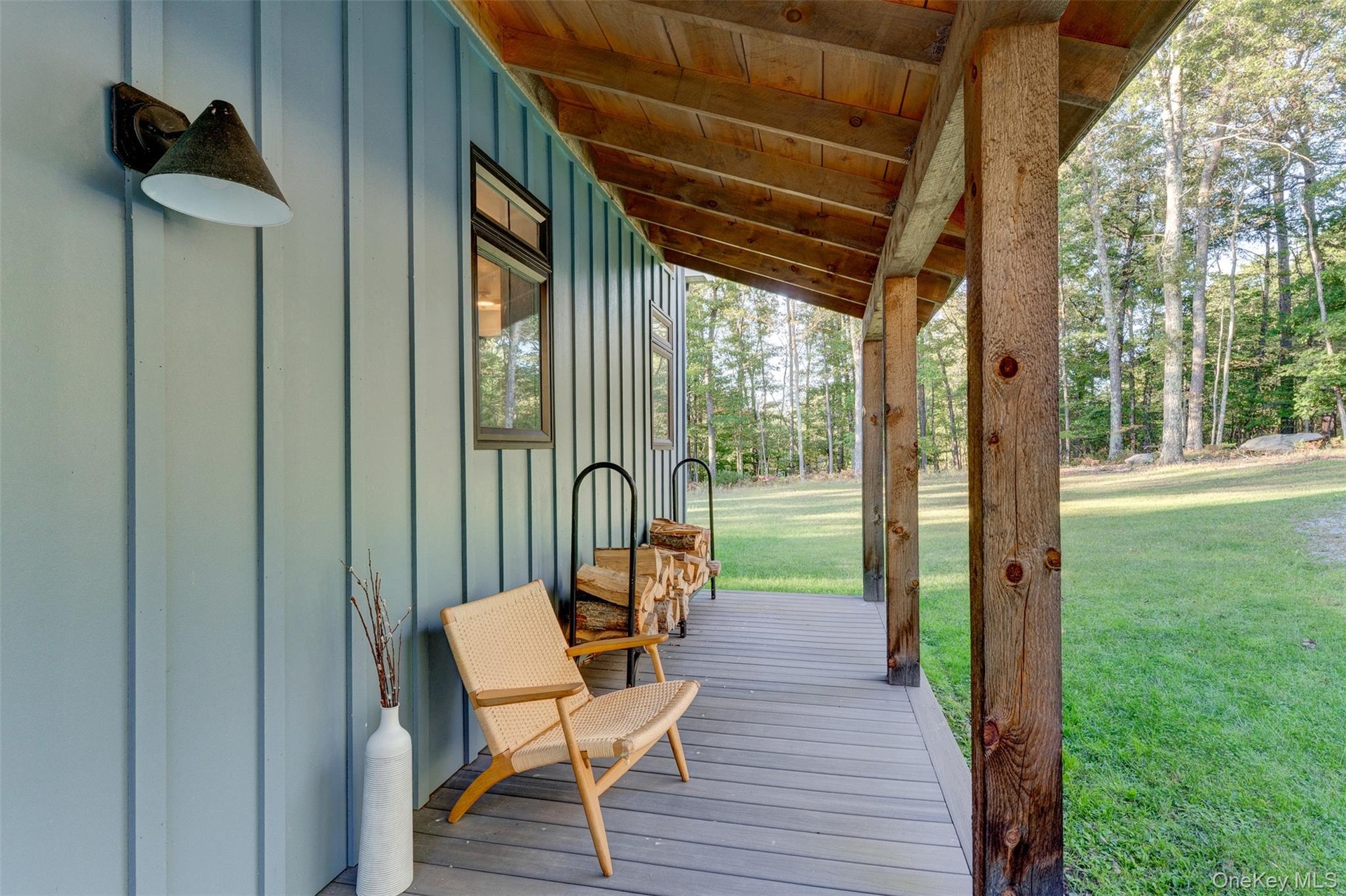 This 3-bedroom, 2.5-bath residence sits on 10 private acres, ideally situated between the sweet river hamlets of Callicoon and Narrowsburg, NY. Designed with both sustainability and comfort in mind, the home combines energy efficiency with modern country living. • The exterior is clad in low-maintenance LP SmartSide engineered wood, while oversized casement windows flood the interiors with natural light. Heating and cooling are handled entirely by efficient mini-splits—no fossil fuels required. • The heart of the home is the great room, where kitchen, dining, and living spaces flow together under high ceilings. The kitchen offers Corian countertops, a generous island with seating for four, and a vented oven. A modern chandelier sets the mood above the dining table, while in the living area, a Malm hanging fireplace and a wall of windows invite cozy evenings and conversation. A very handy half bath is adjacent to the entrance. • From here, two outdoor living spaces extend the home’s footprint: a screened porch with room to lounge, and a broad deck accessible from both the living area and the primary suite. The deck is sized for summer gatherings and dining under the stars, with the added perk of an outdoor shower. • The first-floor primary bedroom is a spacious retreat, with ample closet space, deck access, and a spa-like bath featuring a double vanity and glass-enclosed shower. An attic offers extra storage or the potential for vaulted ceilings. Upstairs, two large bedrooms share a full bath with tub and the convenience of a washer/dryer. The home was crafted by Catskill Energy Homes, a builder known for marrying sustainability with thoughtful design. Here, modern efficiency and Catskills tranquility come together across ten wooded acres.