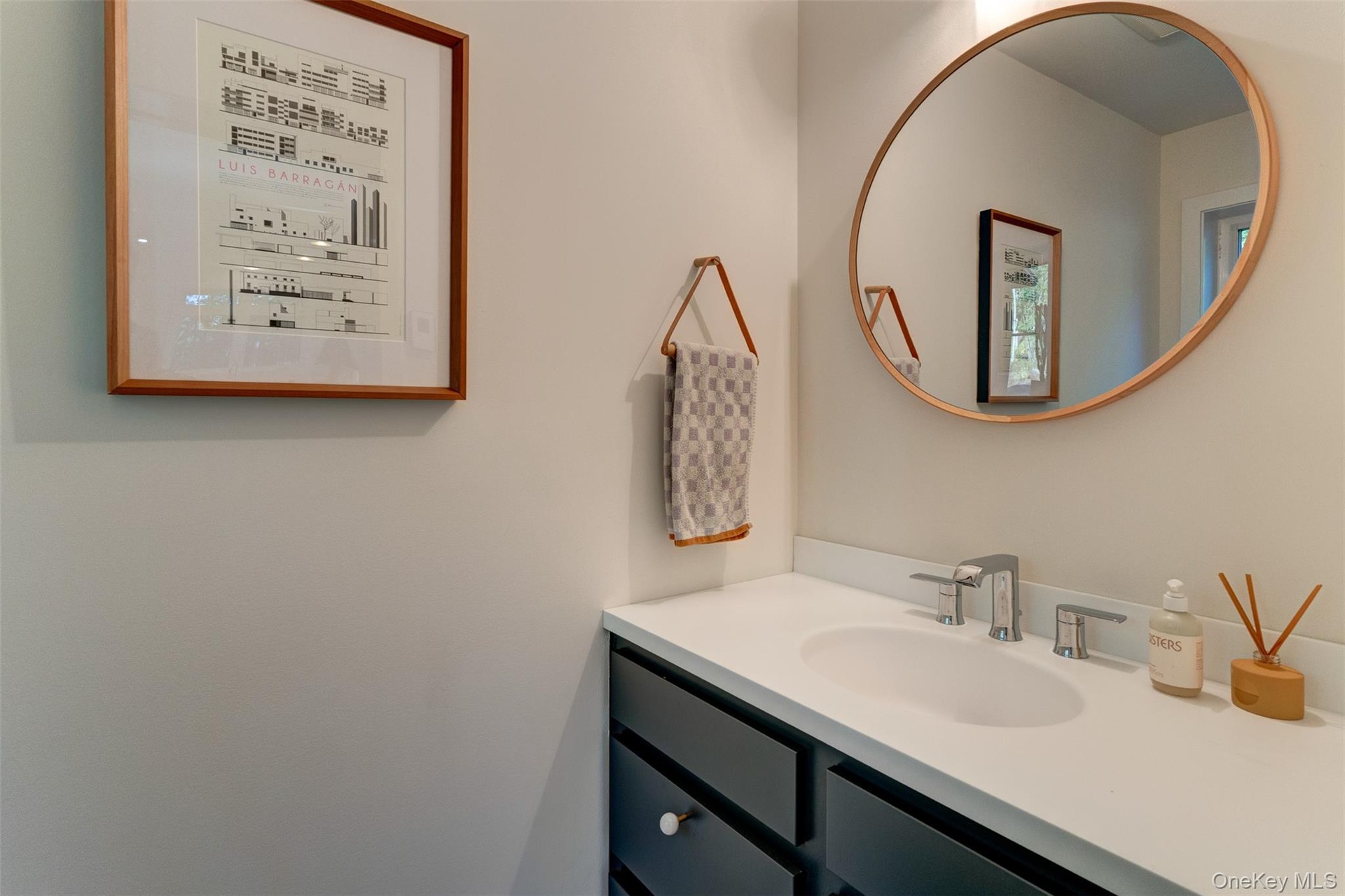 - Bathroom with baseboard heating, vanity, and dark tile patterned flooring