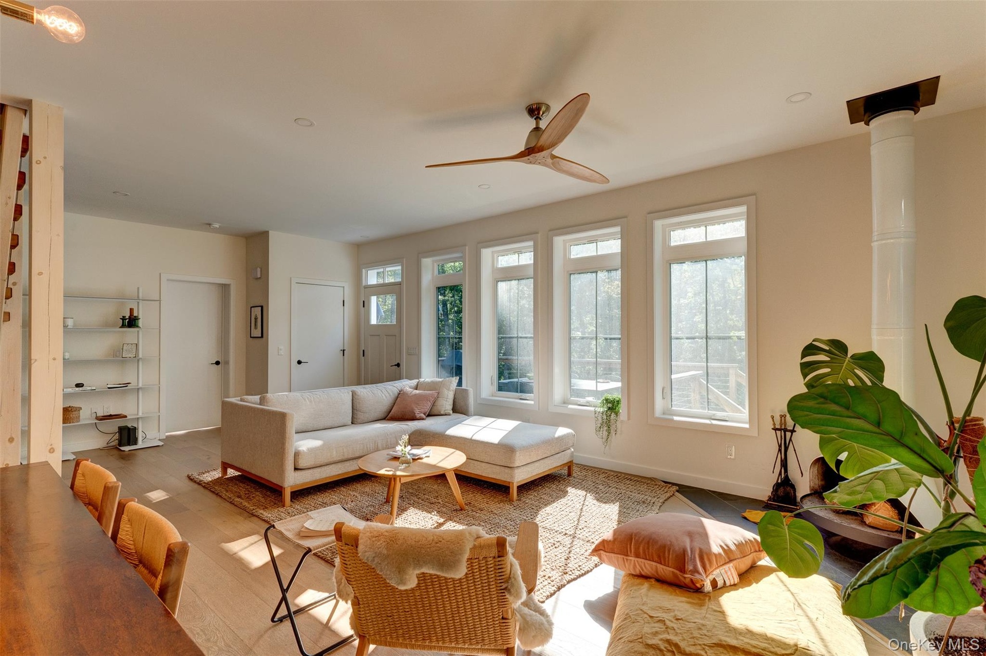 - Living area with hardwood / wood-style flooring and ceiling fan