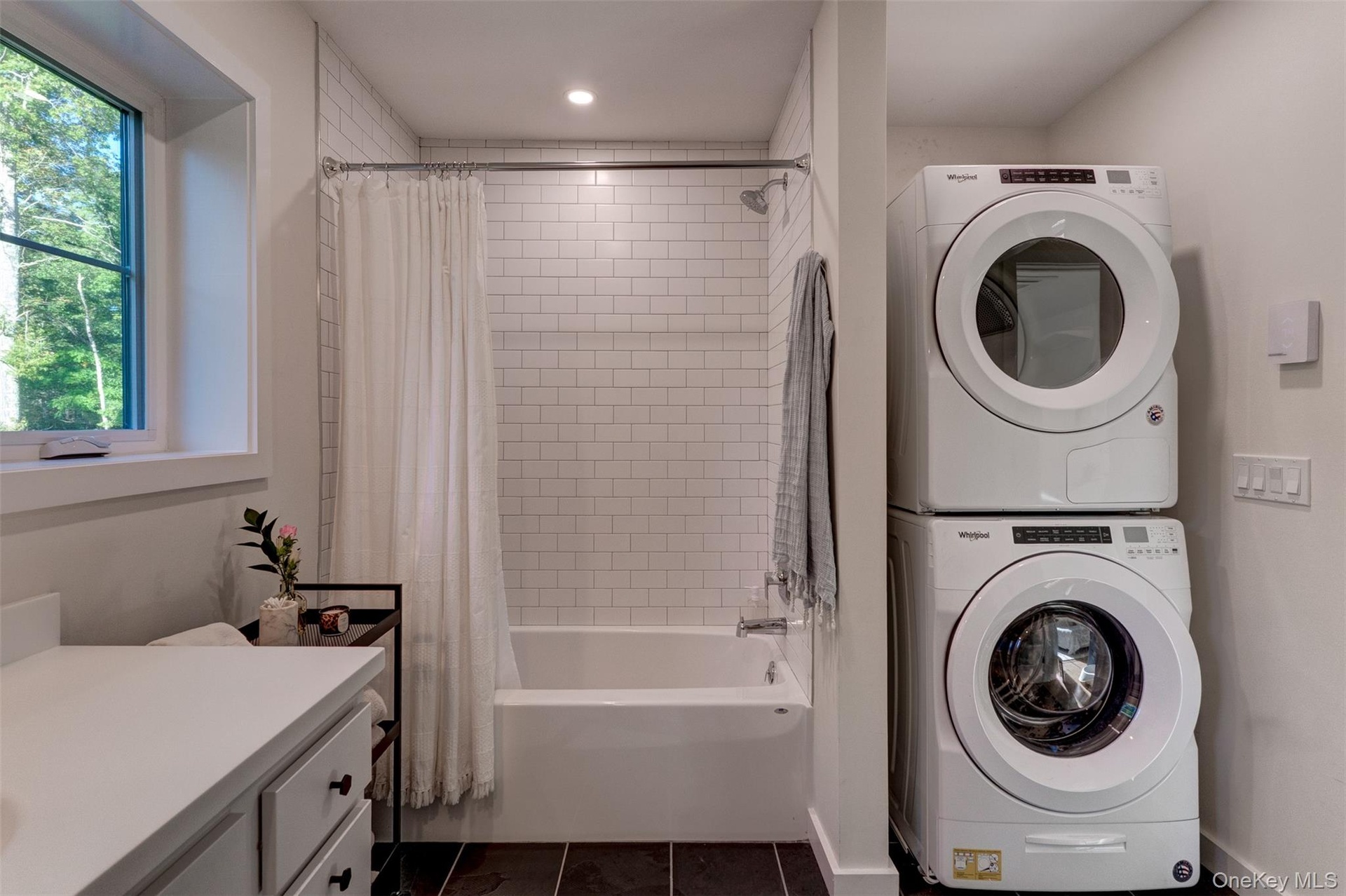 - Full bathroom with shower / tub combo with curtain, vanity, stacked washer / dryer, and dark tile patterned flooring