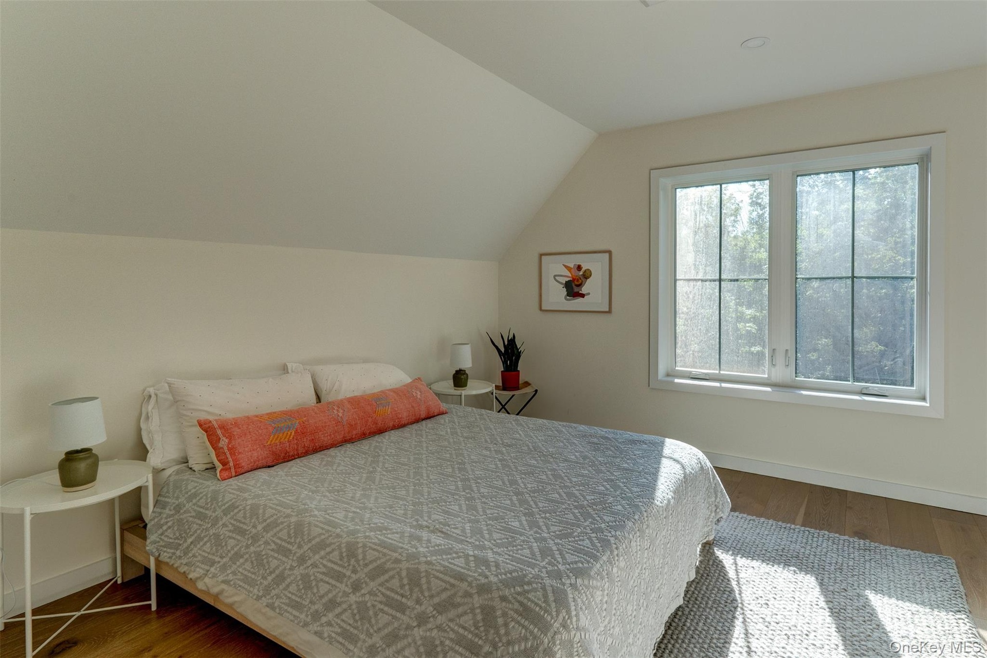 - Bedroom featuring wood finished floors and vaulted ceiling