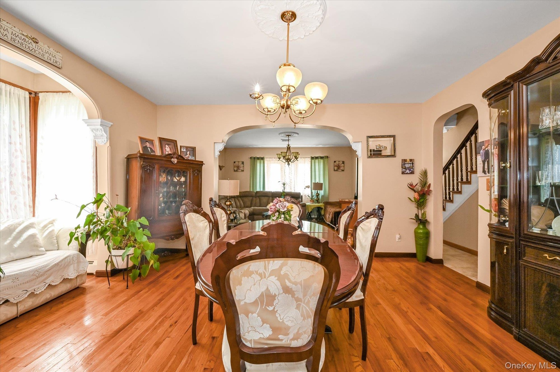 - Dining space featuring a chandelier, light wood-type flooring, stairway, and arched walkways