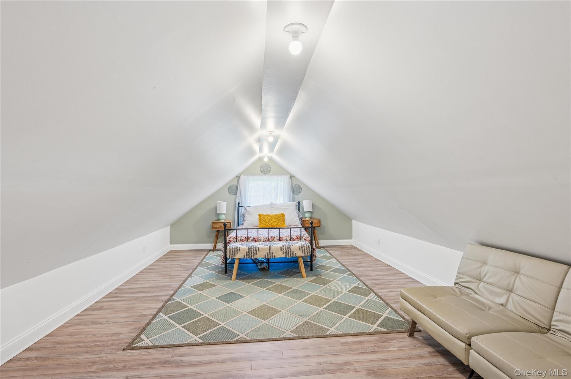 - Bedroom featuring light wood-type flooring and vaulted ceiling