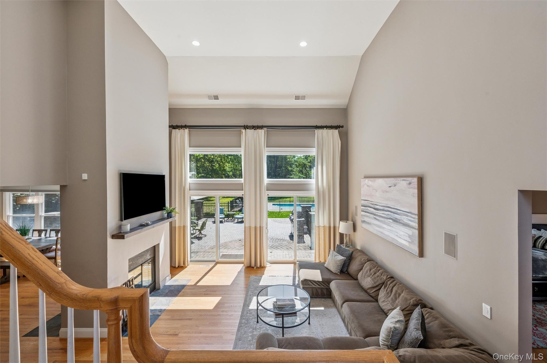 - Living room featuring light wood-style flooring and high vaulted ceiling