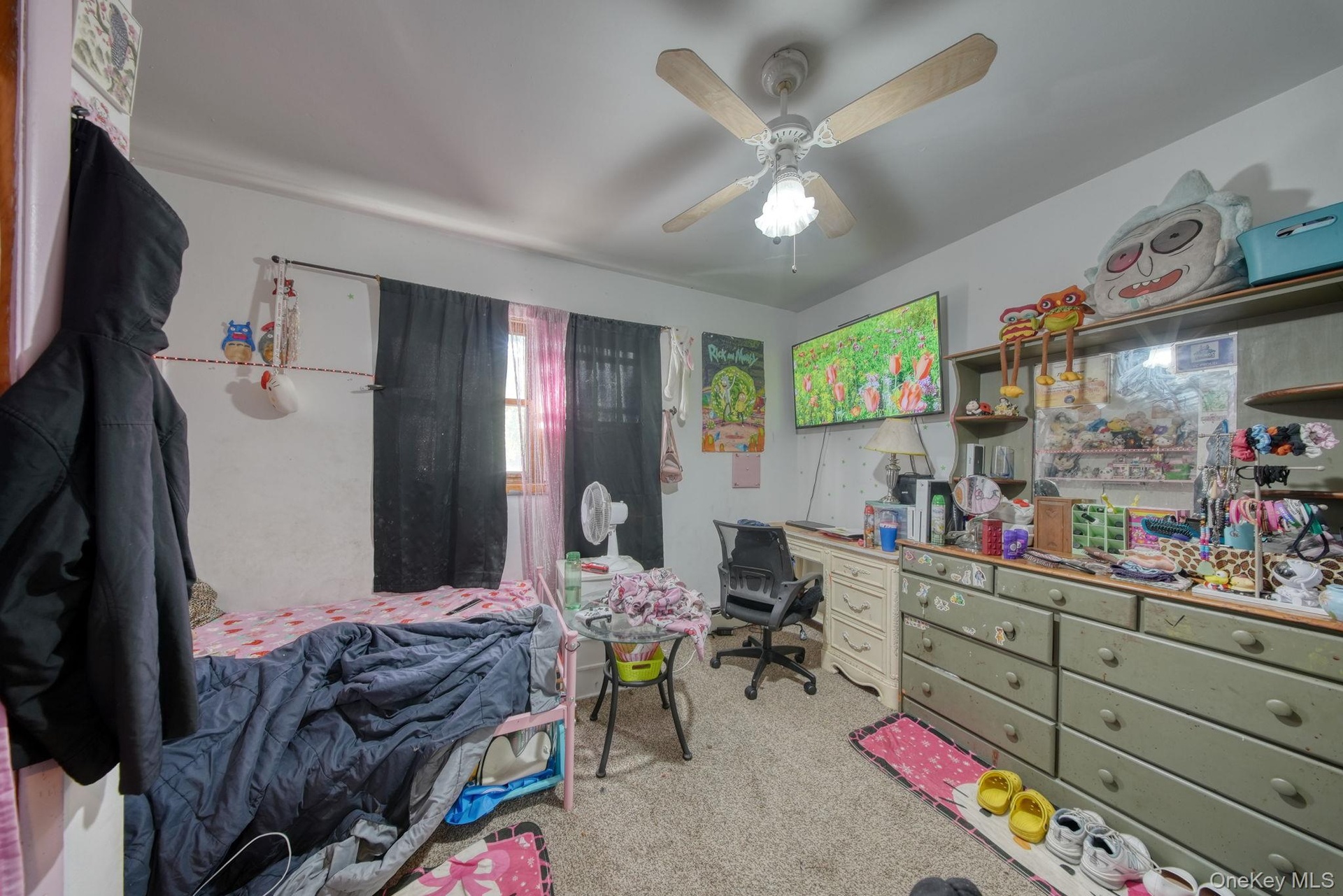 - Carpeted bedroom with a ceiling fan and cooling unit