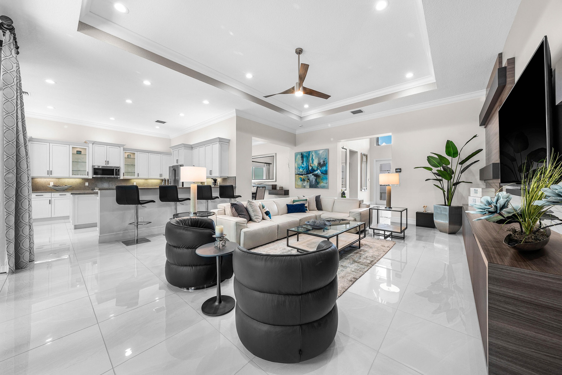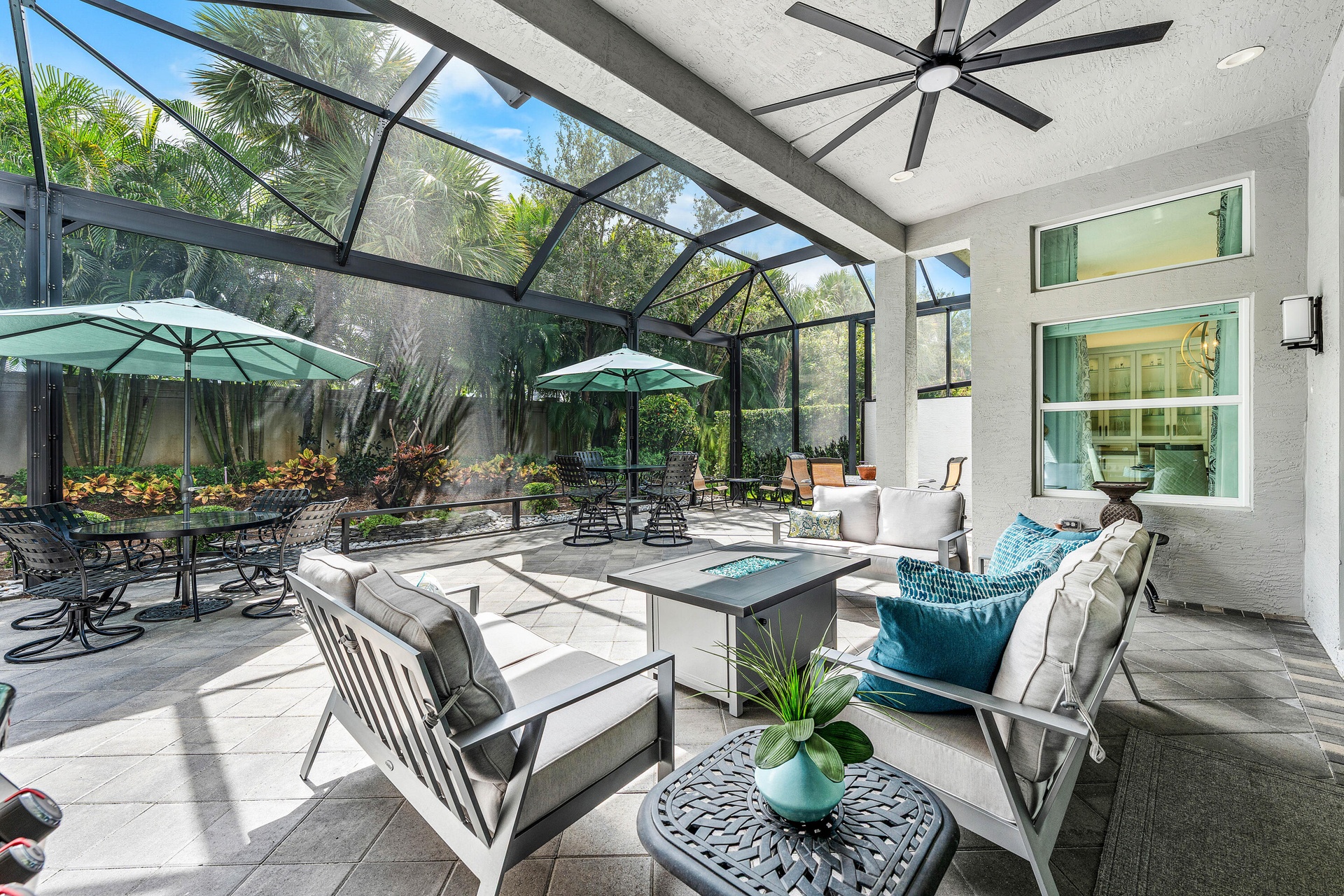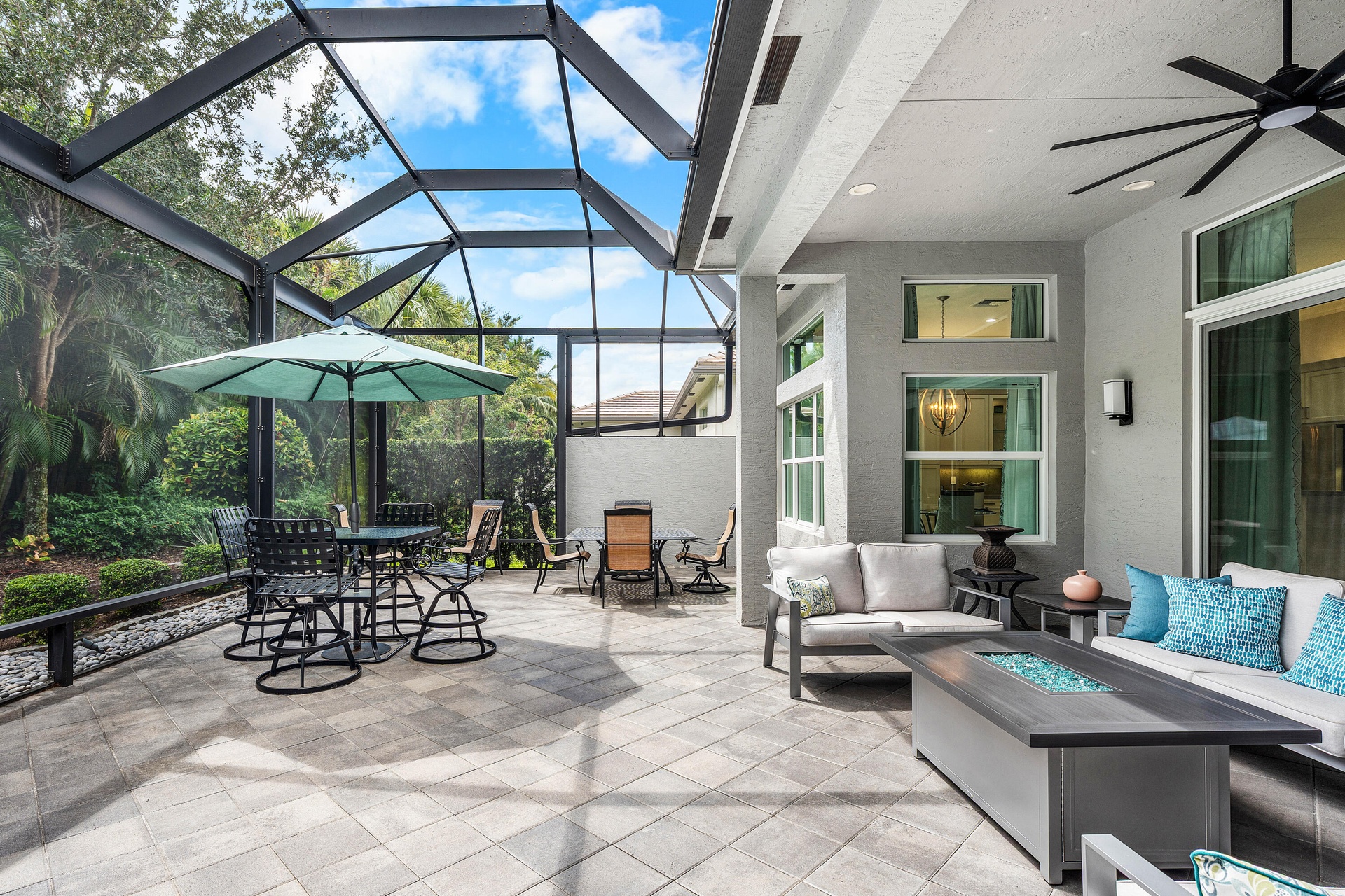 This beautifully appointed Caroline model sits on a lushly landscaped private lot backing south. Great curb appeal - private gate and etched glass double door entry. The home (2/2.1+Club room+3cg) features impact windows, upgraded AC, 24'' porcelain floors, crown moldings, designer wall treatments and wallpapers, designer window treatments and light fixtures, hi-hats, fans, custom built-ins, outfitted closets, upgraded bathrooms and more! The gourmet kitchen has white wood cabinetry, built-in hutch, quartz countertops, center island, snack bar, breakfast nook, GE Cafe appliances including induction cooktop and all the bells and whistles! Luxurious primary suite! You'll love the covered, extended patio, birdcage with picture frame screen and beautiful landscaping with landscape lighting!