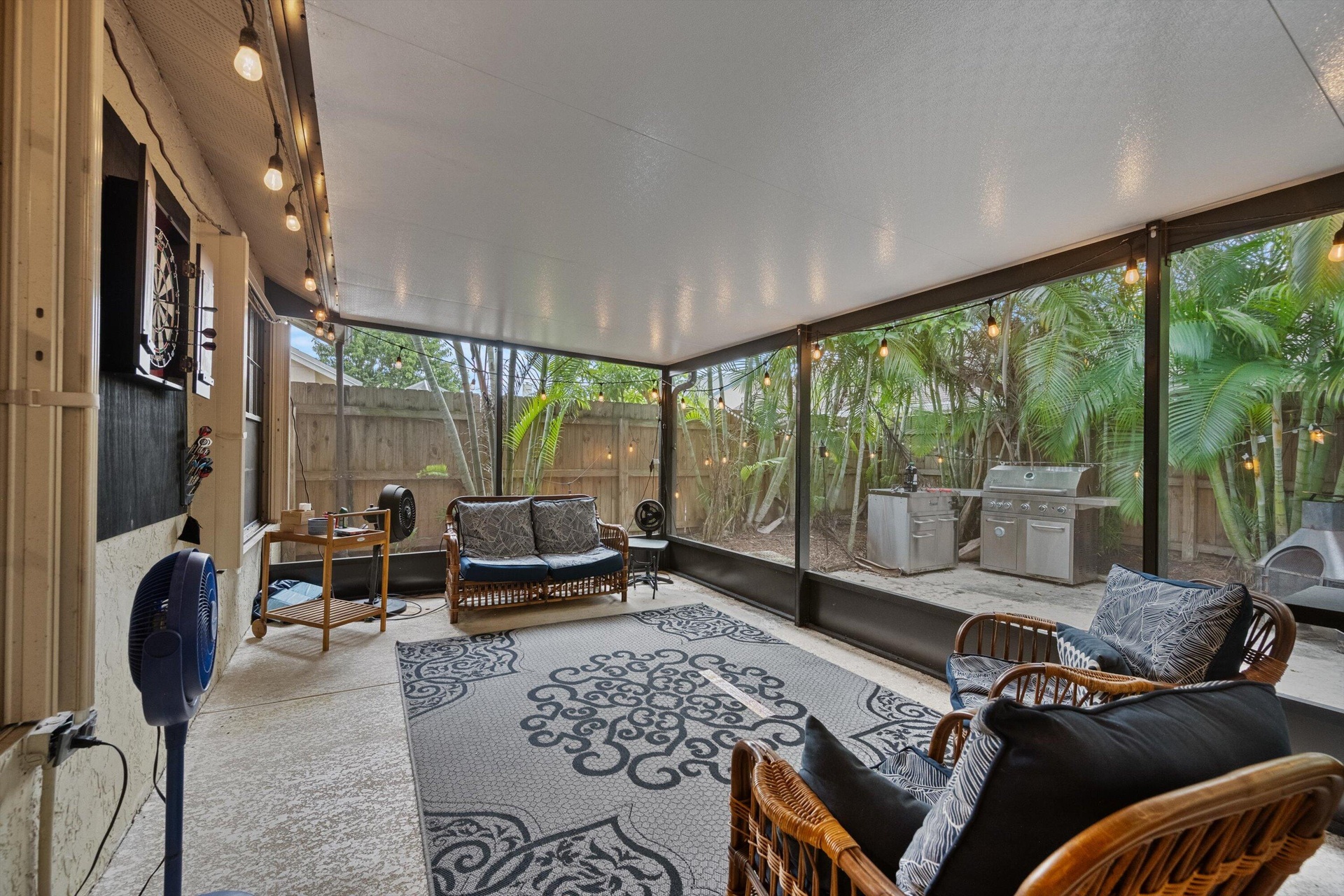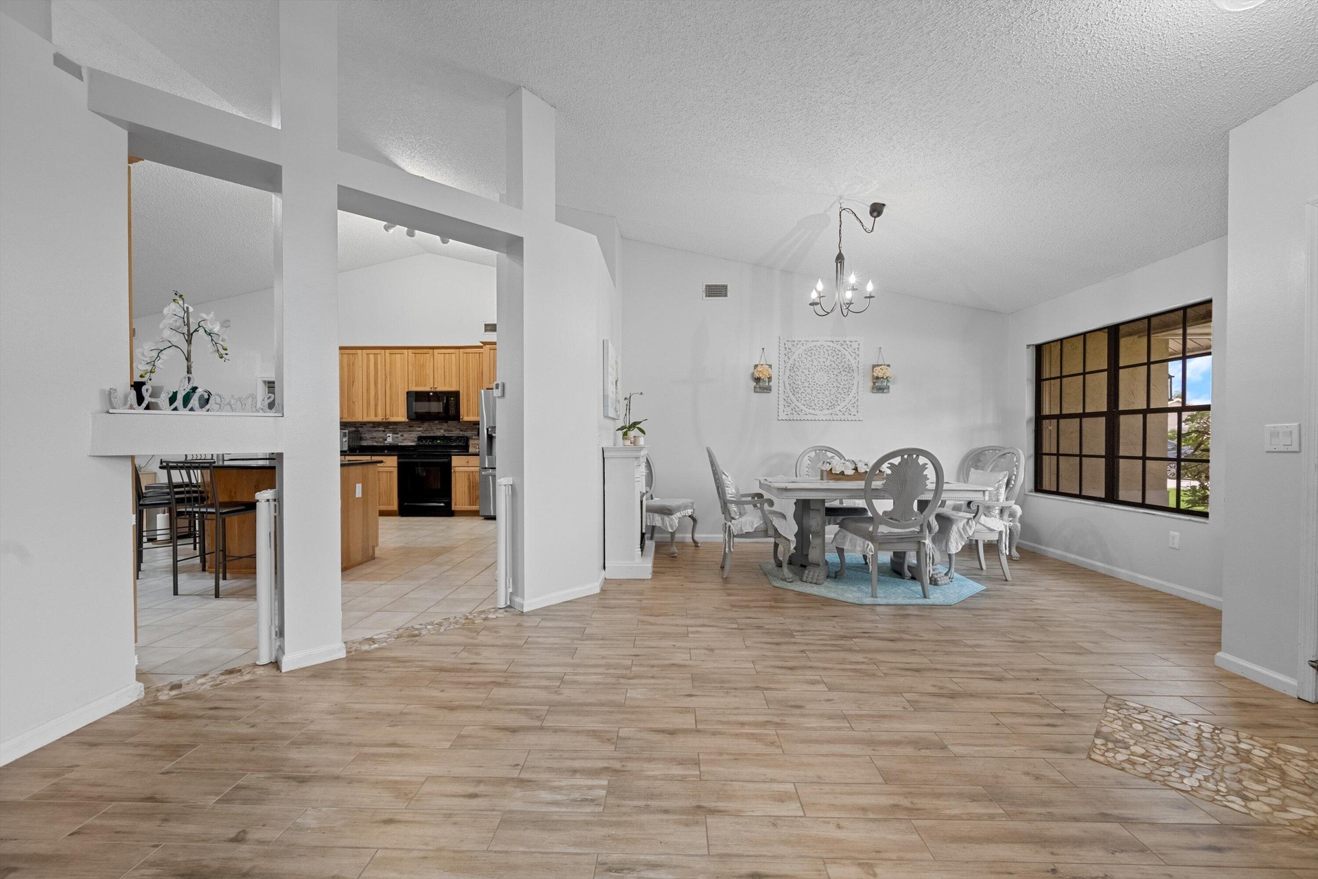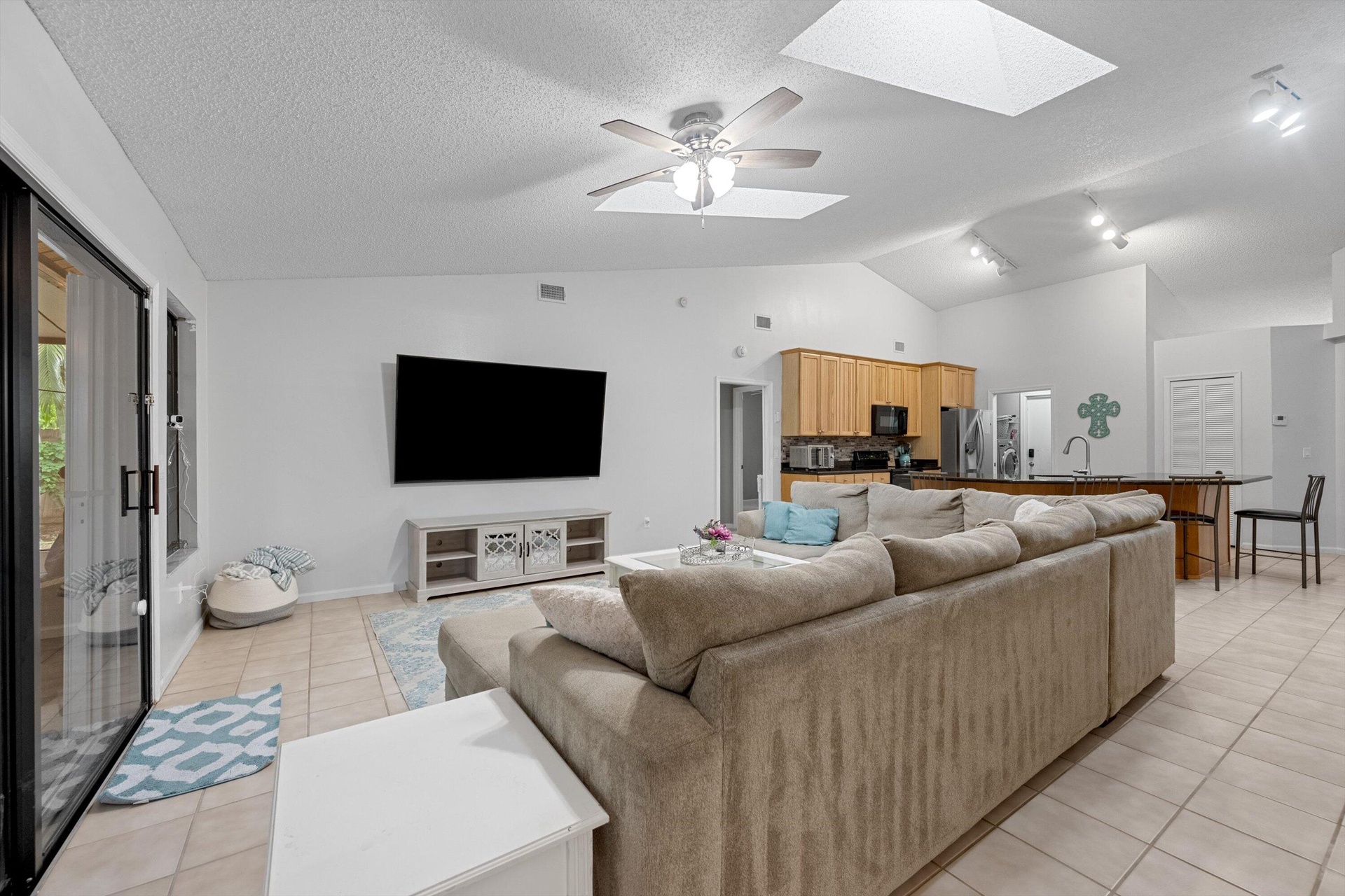This 3 bedroom 2 bath home has over 1,850 living square feet of comfort! The entry living room has been updated with newer tile flooring and leads to the grand family room. The home has an open floor plan with vaulted ceilings and skylights. The kitchen has beautiful light oak cabinets with granite counter tops of which opens to the family room offering eat-in sitting area overlooking the gardens. The primary bedroom is large with walk-in closet and large bathroom with dual sinks, a separate tub and shower. The covered patio has been added and is screened within the spacious fenced yard. The gated community has a clubhouse swimming pool and offers a boat ramp to Lake Wellington for fishing or pontoon cruising. Great location within minutes to shopping and equestrian venues.