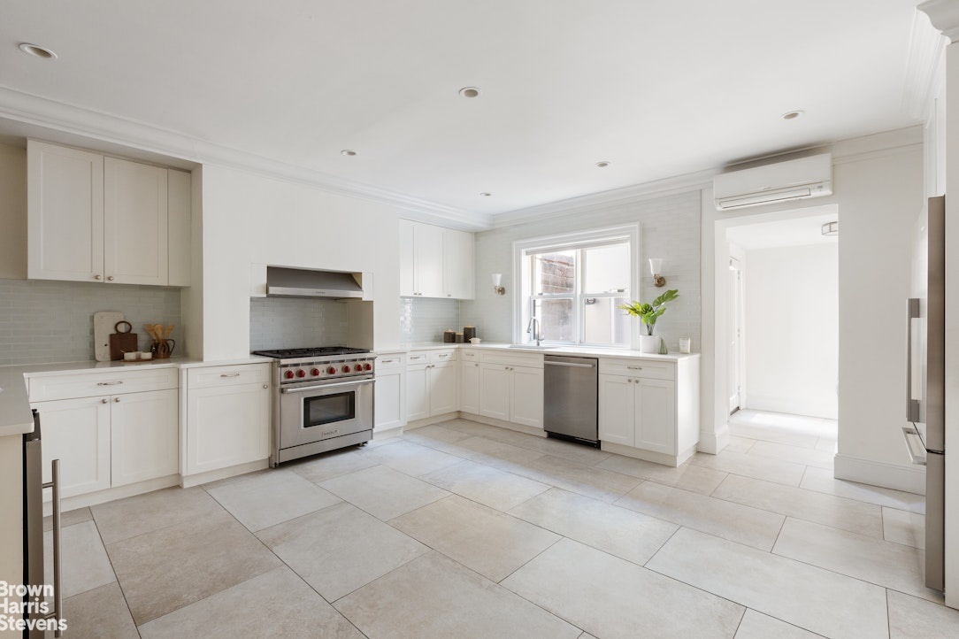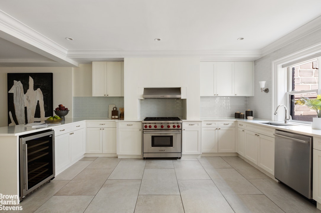 On the garden level, restored parquet hardwood floors, elegant decorative fireplaces, and original columns showcase the home's historic craftsmanship. Toward the rear, a formal dining area transitions into the state-of-the-art chef's kitchen, outfitted with a Wolf range, Bosch dishwasher, Summit wine cooler, and abundant custom cabinetry. A subway tile backsplash, polished fixtures, and thoughtfully placed wall sconces complete the space, while a separate laundry room with Whirlpool washer/dryer adds everyday ease.