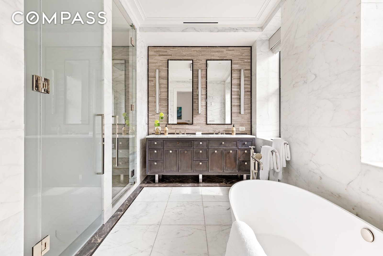 Down the foyer just beyond the gorgeous powder room is the exceptionally large primary suite. Enter into a long, wide foyer to find a gracious walk-in-closet and dressing area followed immediately by the luxurious, massive bedroom framed by both southern and western exposures. The generous primary bathroom, meanwhile, is truly spa-like. Calacatta Gold and Tundra Grey marble tiles are tied together with custom Haisa marble mosaics while the deep-soaking tub, sprawling double vanity, and radiant heated floors provide a blissful retreat.