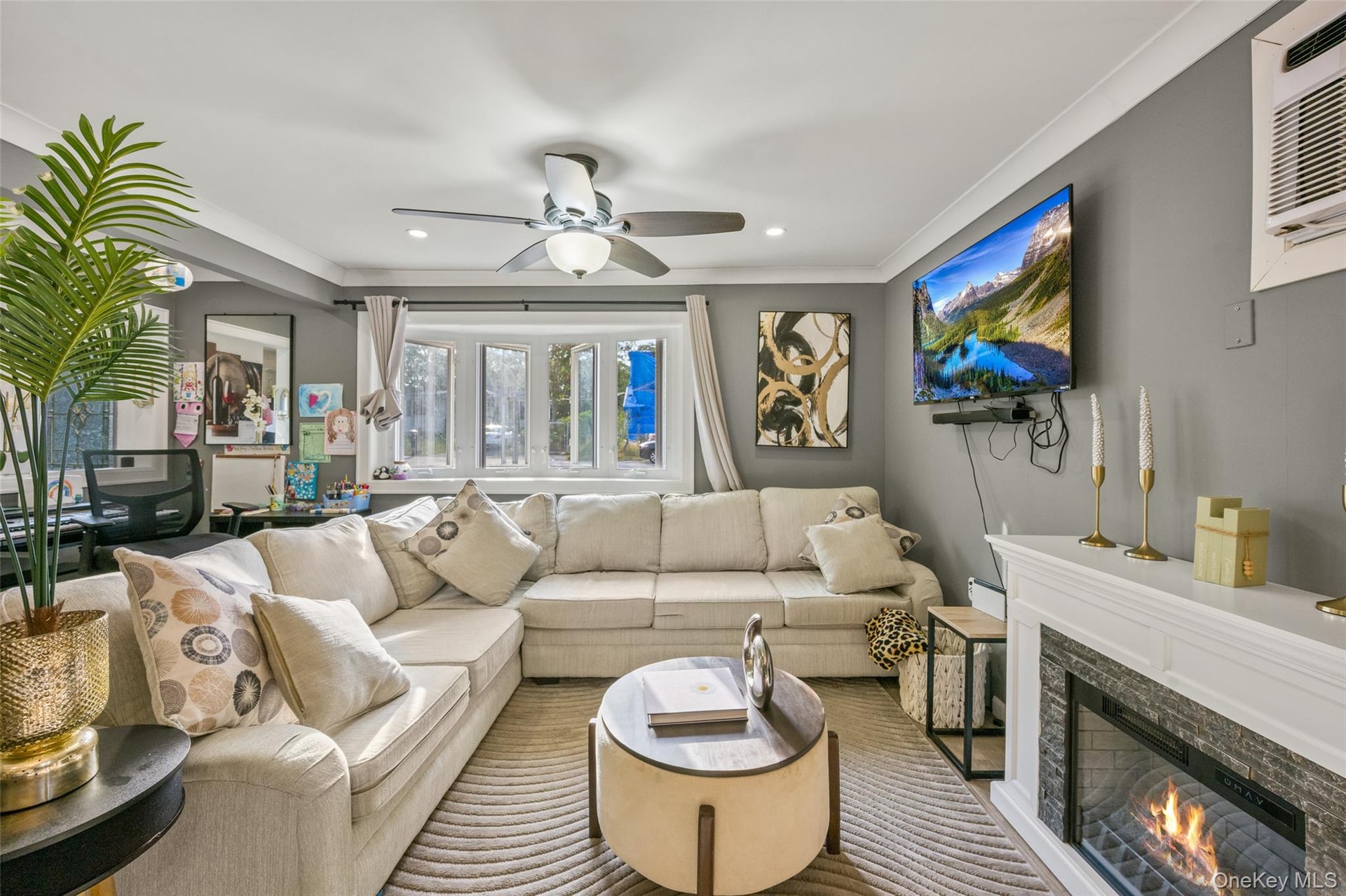 - Living room featuring a fireplace, ceiling fan, a wall mounted air conditioner, crown molding, and recessed lighting