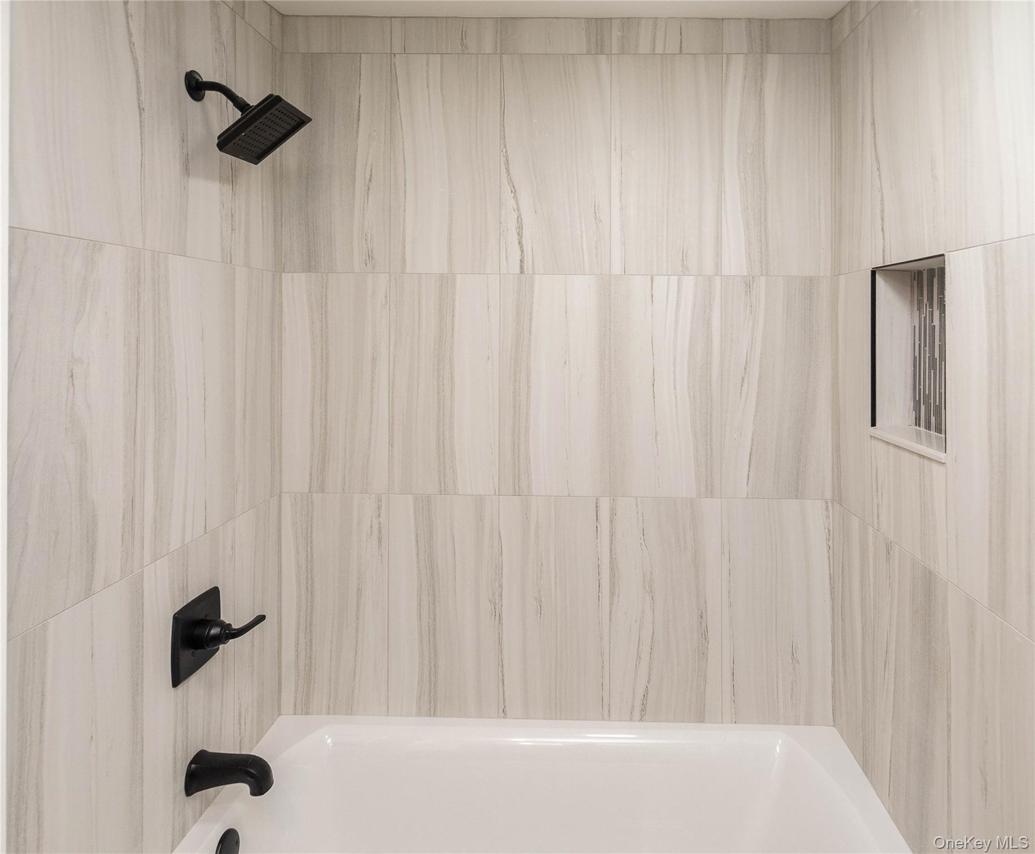- Kitchen featuring white cabinets, electric range, backsplash, light stone countertops, and recessed lighting